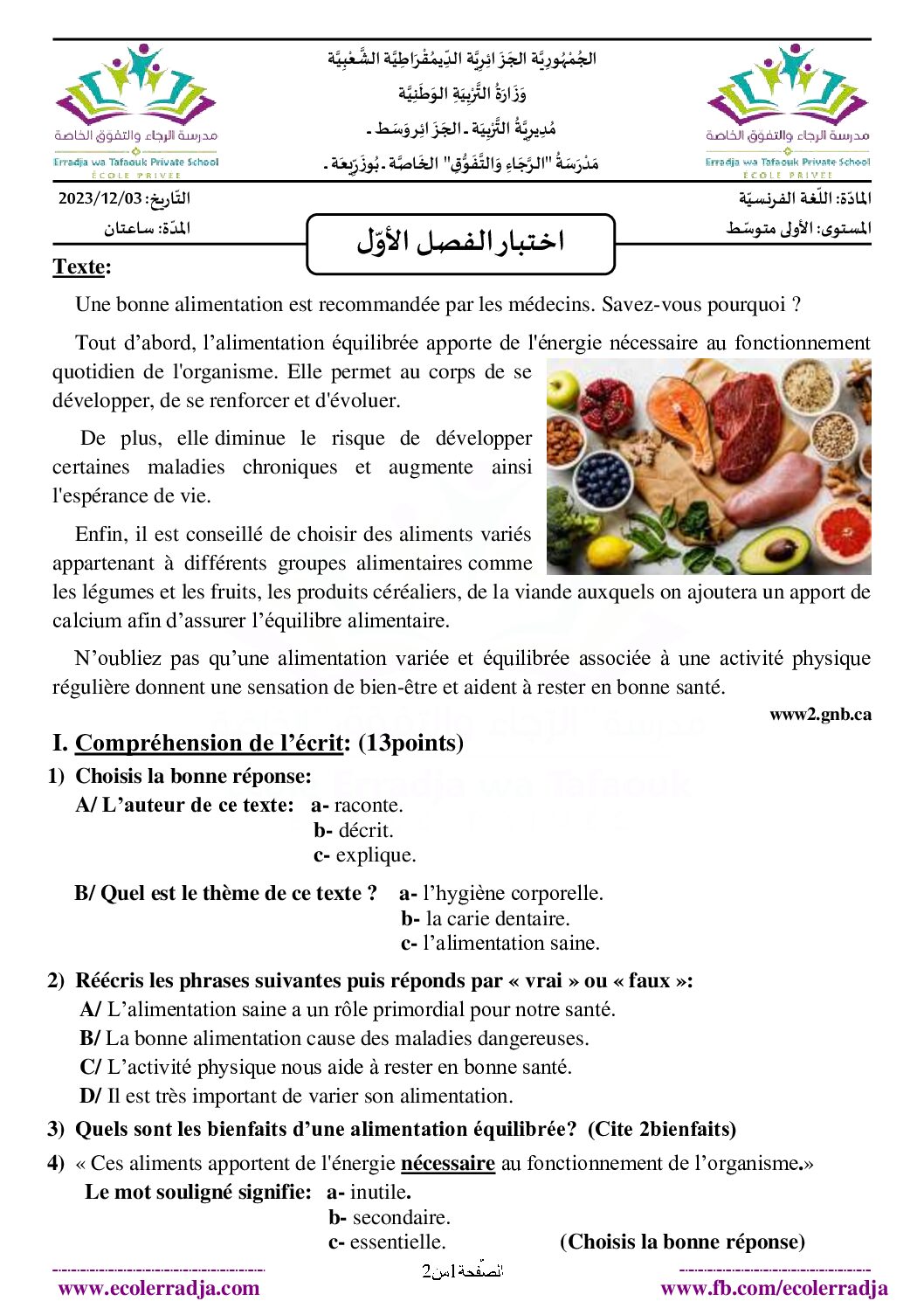 اختبار في اللغة الفرنسية الفصل الأول السنة الأولى متوسط رقم 52 مع التصحيح