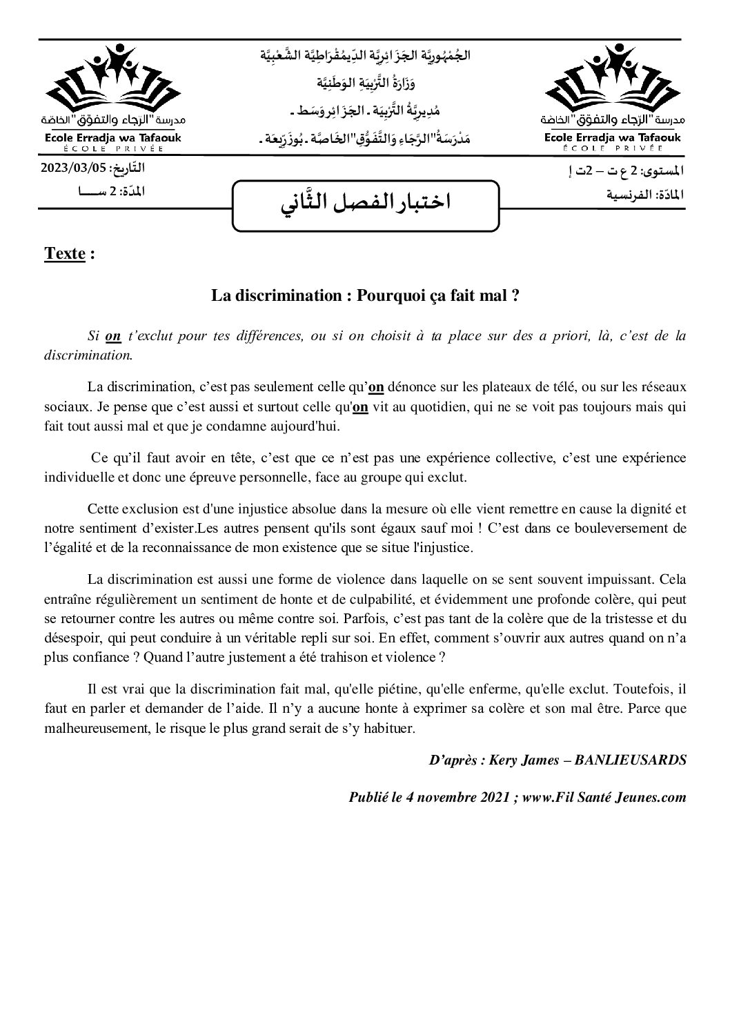 اختبار في اللغة الفرنسية الفصل الثاني السنة الثانية ثانوي علمي رقم 27 مع التصحيح