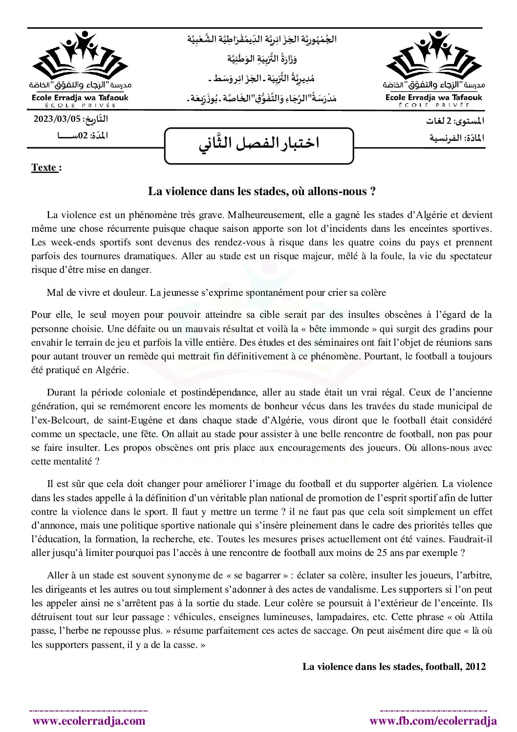 اختبار في اللغة الفرنسية الفصل الثاني السنة الثانية ثانوي علمي رقم 28 مع التصحيح