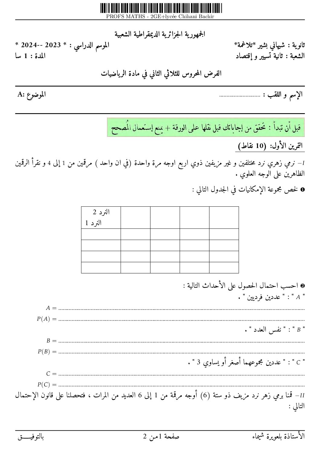 اختبار في الرياضيات الفصل الثاني السنة الثانية ثانوي علمي رقم 94