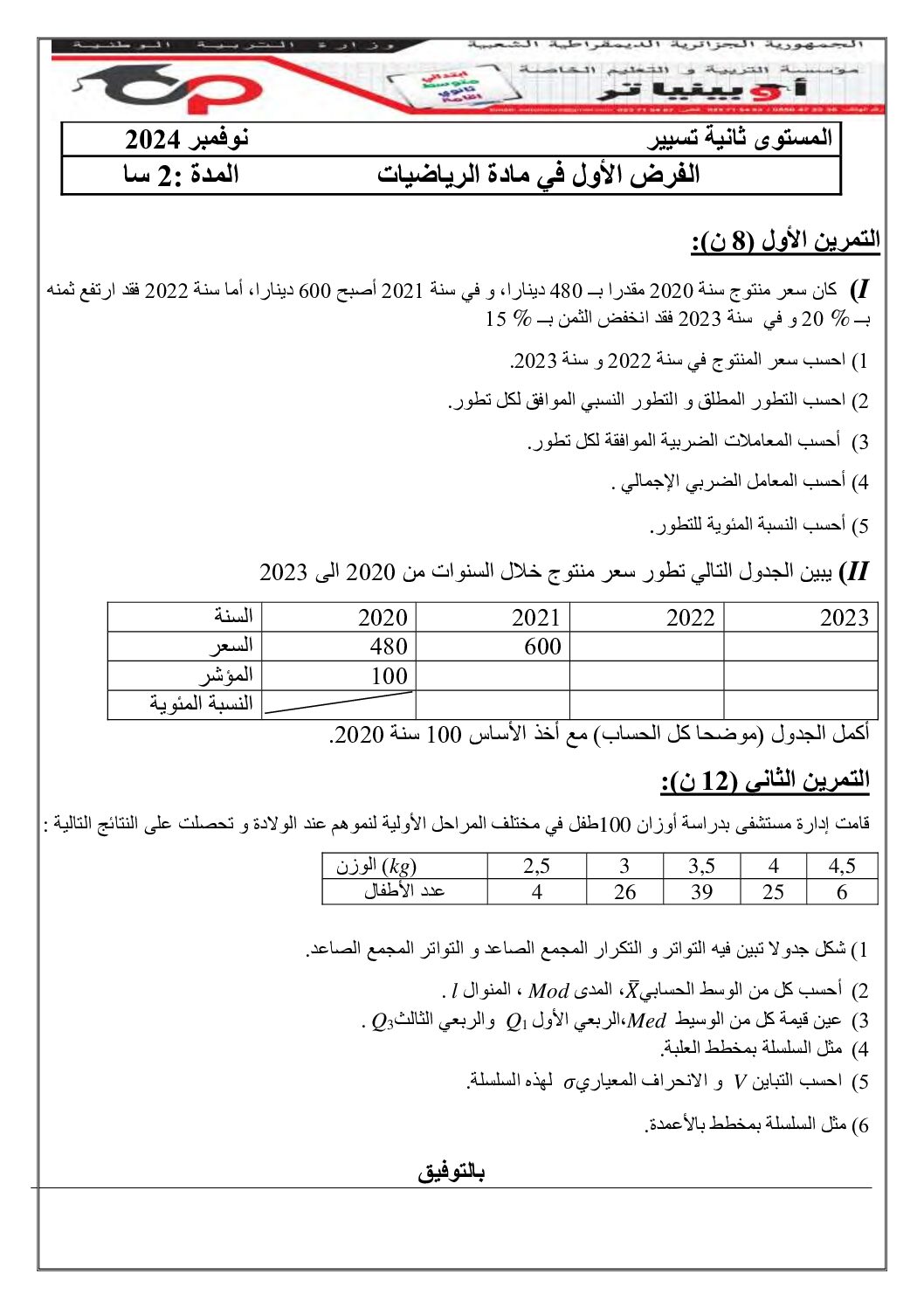 فرض في الرياضيات الفصل الأول السنة الثانية ثانوي تسيير رقم 17 مع التصحيح