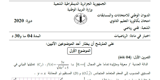 حلول مواضيع شهادة البكالوريا 2024 BAC – الإجابة النموذجية و تصحيح موضوع اختبار مادة الرياضيات شعبة رياضيات بكالوريا 2024: وفيما يلي تصحيح موضوع البكالوريا : يمكن تصفح تصحيح الموضوع مباشرة عبر موقع الدراسة الجزائري أو تحميله مباشرة بصيغة PDF بالضغط أعلاه على: .: تحميل :. مواضيع و حلول بكالوريا 2024 جميع المواد والشعب