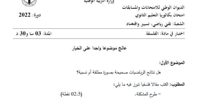 مواضيع و حلول بكالوريا 2019 BAC جميع الشعب: موضوع امتحان بكالوريا دورة جوان 2019 BAC : شعبة: آداب و لغات أجنبية ، اختبار مادة الفلسفة لبكالوريا 2019: وفيما يلي موضوع البكالوريا : يمكن تصفح الموضوع مباشرة عبر موقع الدراسة الجزائري أو تحميله مباشرة بصيغة PDF بالضغط أعلاه على: .: تحميل :.