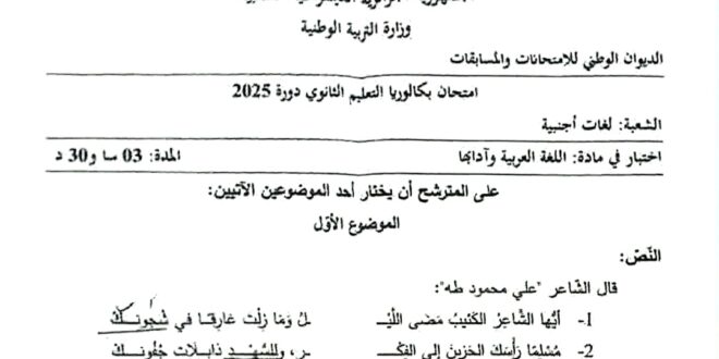 دليل بناء اختبار اللغة العربية في شهادة البكالوريا : في إطار الإصلاحات الجوهرية التي تقوم بها وزارة التربية الوطنية، و التي كرسها القانون التوجيهي للتربية، و نتيجة لما عرفه امتحان شهادة البكالوريا من تطورات على مختلف المستويات، و من أجل ربط وظيفة التدريس بتكوين التلميذ تكوينا سليما، كانت الحاجة ماسة لتقويم طريقة اعداد المواضيع و كيفية بنائها و من ثمة …