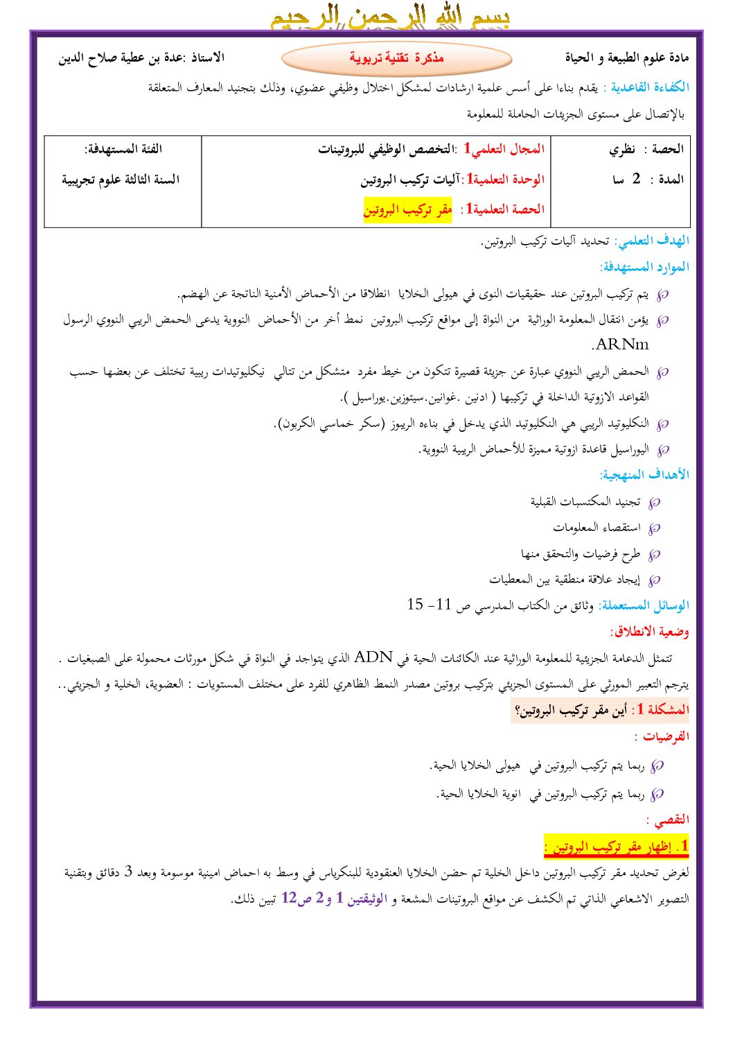مذكرات وحدة مقر تركيب البروتين للأستاذ إسياف محمد 3 ثانوي