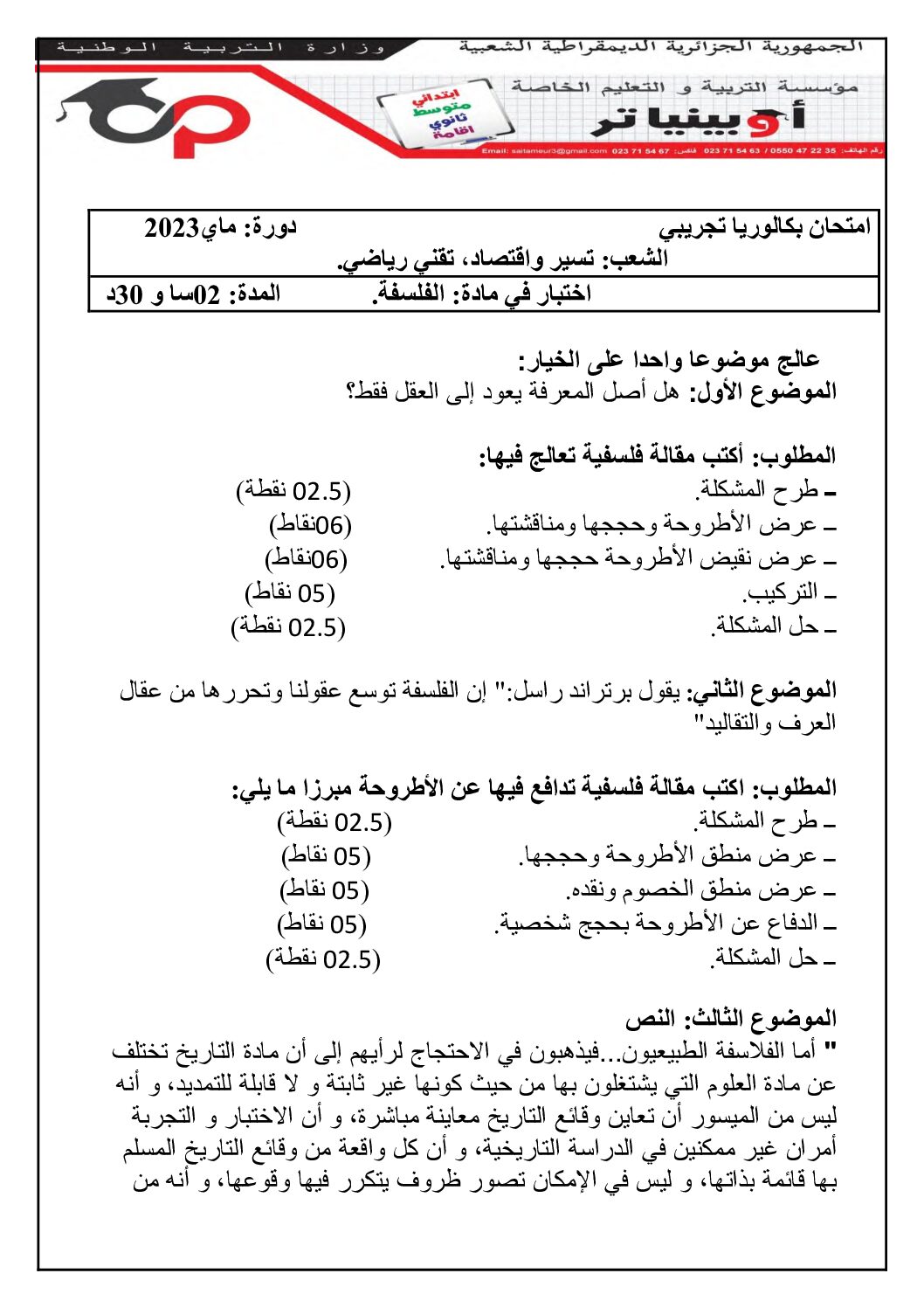 اختبار في الفلسفة الفصل الثالث السنة الثالثة ثانوي تسيير وتقني رقم 12 مع التصحيح