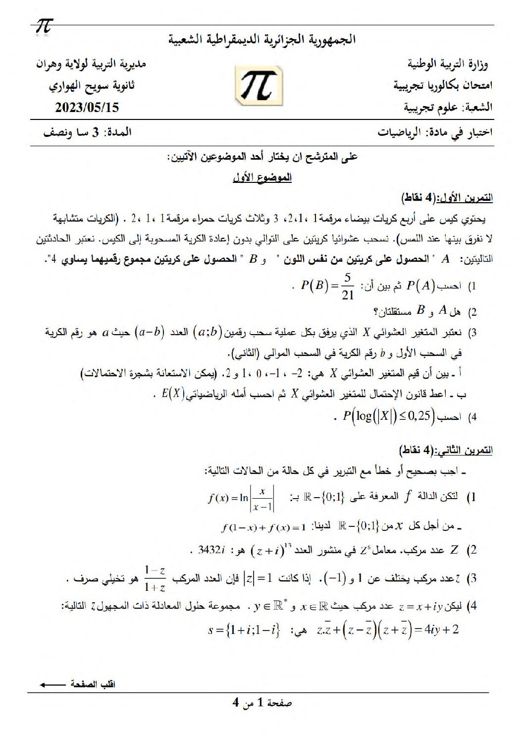 اختبار في الرياضيات الفصل الثالث السنة الثالثة ثانوي علمي رقم 215