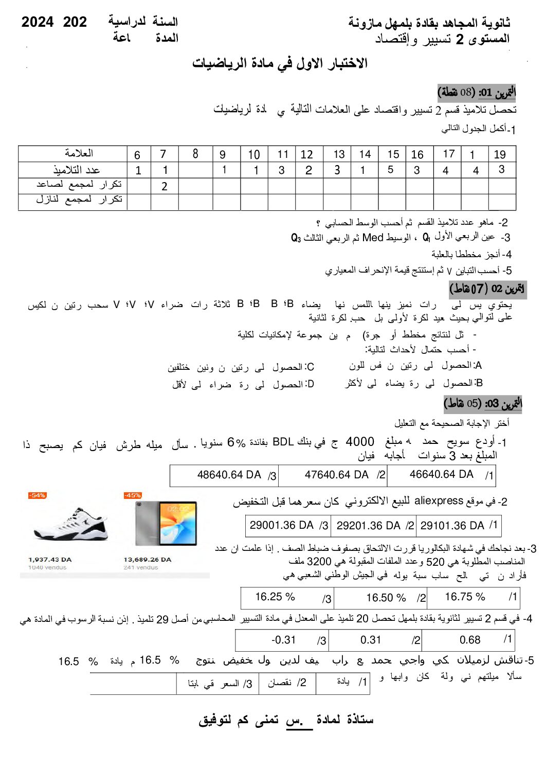 مادة الرياضيات للسنة الثانية 2 ثانوي دروس مفصلة، فروض واختبارات، تمارين محلولة: نموذج لإمتحان في الفصل الأول رقم 20- في مادة الرياضيات مستوى السنة الثانية ثانوي شعبة تسيير واقتصاد، السنة الدراسية: 2024/2025 مع التصحيح يمكن تصفح الإختبار مباشرة عبر موقع الدراسة الجزائري أو تحميله مباشرة بصيغة …