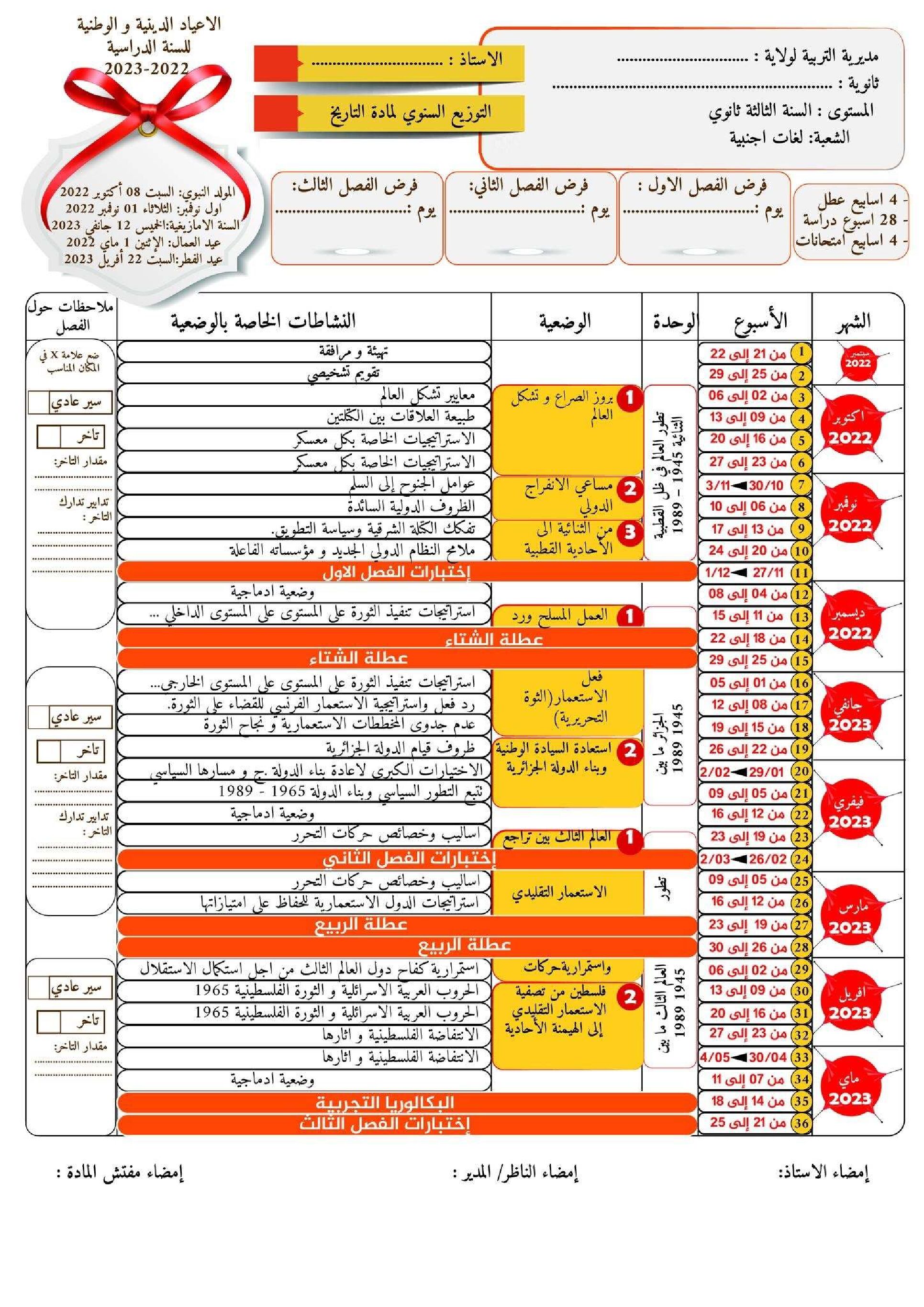التوزيع السنوي لمادة التاريخ شعبة آداب و فلسفة و تسيير و اقتصاد 2023 3 ثانوي