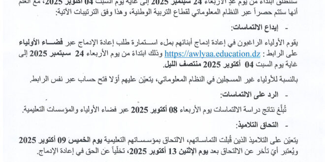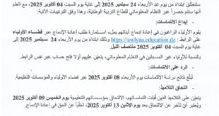 أعلنت وزارة التربية الوطنية إلى علم الأولياء الراغبين في طلب التماس إعادة إدماج أبنائهم في مرحلتي التعليم المتوسط والتعليم الثانوي العام والتكنولوجي بعنوان السنة الدراسية 2026/2025، أن العملية ستنطلق ابتداء من يوم غد الأربعاء 24 سبتمبر 2025 إلى غاية يوم السبت 04 أكتوبر 2025، مع العلم أنها ستتم حصراً عبر النظام المعلوماتي لقطاع التربية الوطنية، وهذا وفق الترتيبات الآتية: إيداع …