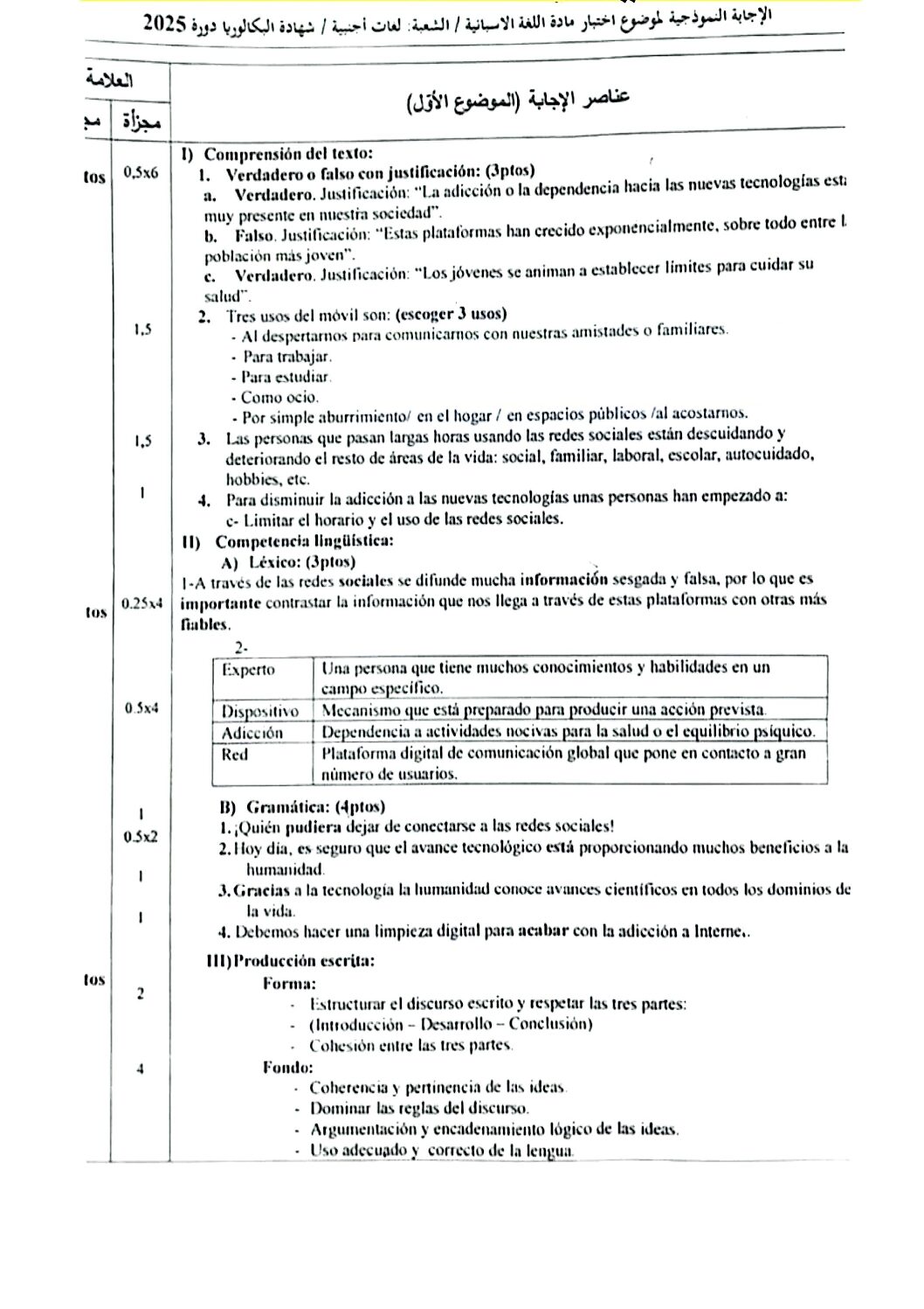 حلول مواضيع شهادة البكالوريا 2025 BAC – الإجابة النموذجية و تصحيح موضوع اختبار مادة اللغة الإسبانية شعبة لغات أجنبية بكالوريا 2025 :