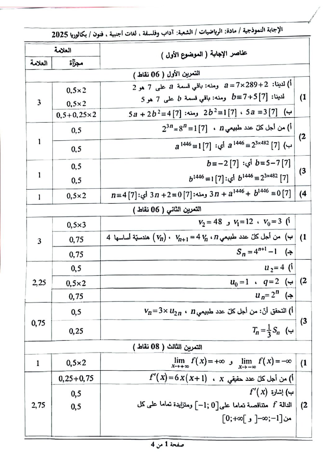 حلول مواضيع شهادة البكالوريا 2025 BAC – الإجابة النموذجية و تصحيح موضوع اختبار مادة الرياضيات شعبة آداب وفلسفة ، لغات أجنبية بكالوريا 2025: