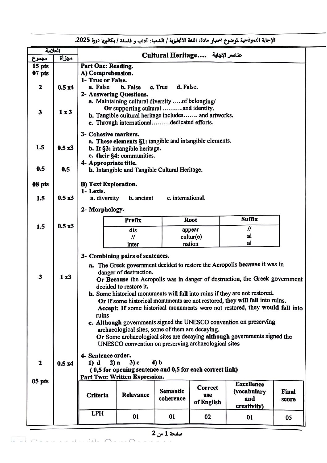 حلول مواضيع شهادة البكالوريا 2025 BAC – الإجابة النموذجية و تصحيح موضوع اختبار مادة اللغة الإنجليزية شعبة آداب وفلسفة بكالوريا 2025: