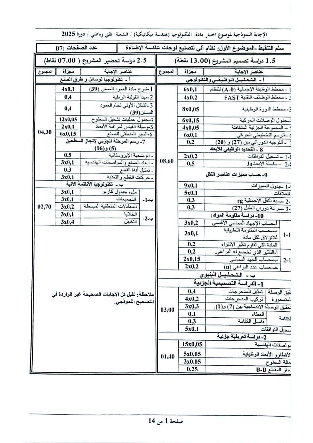 حلول مواضيع شهادة البكالوريا 2025 BAC – الإجابة النموذجية و تصحيح موضوع اختبار مادة التكنولوجيا الهندسة الميكانيكية شعبة تقني رياضي بكالوريا 2025 :