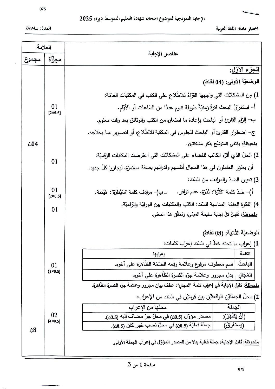 تصحيح موضوع امتحان شهادة التعليم المتوسط 2025 BEM – حل موضوع اختبار مادة اللغة العربية الرسمي لشهادة التعليم المتوسط 2025