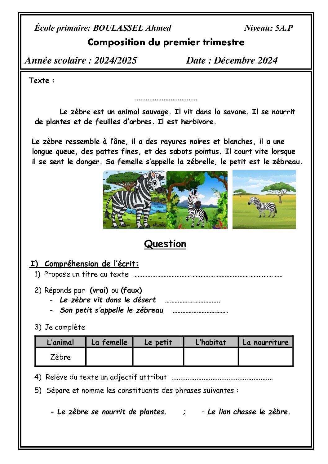 مادة اللغة الفرنسية للسنة الخامسة ابتدائي : نموذج لإمتحان في الفصل الأول رقم 148- في مادة اللغة الفرنسية مستوى السنة الخامسة ابتدائي الجيل الثاني ، السنة الدراسية: 2025/2026 مع التصحيح يمكن تصفح الإختبار مباشرة عبر موقع الدراسة الجزائري أو تحميله مباشرة بصيغة PDF بالضغط أعلاه على: .: تحميل :. اللغة الفرنسية السنة الخامسة ابتدائي