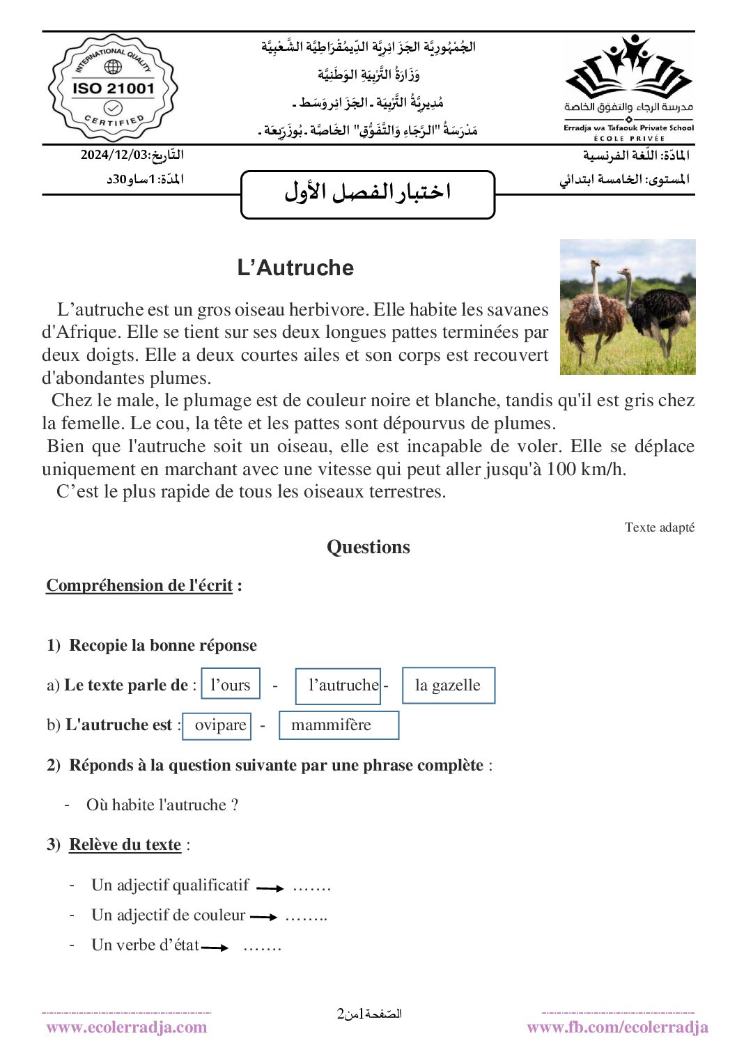 مادة اللغة الفرنسية للسنة الخامسة ابتدائي : نموذج لإمتحان في الفصل الأول رقم 142- في مادة اللغة الفرنسية مستوى السنة الخامسة ابتدائي الجيل الثاني ، السنة الدراسية: 2025/2026 مع التصحيح يمكن تصفح الإختبار مباشرة عبر موقع الدراسة الجزائري أو تحميله مباشرة بصيغة PDF بالضغط أعلاه على: .: تحميل :. اللغة الفرنسية السنة الخامسة ابتدائي