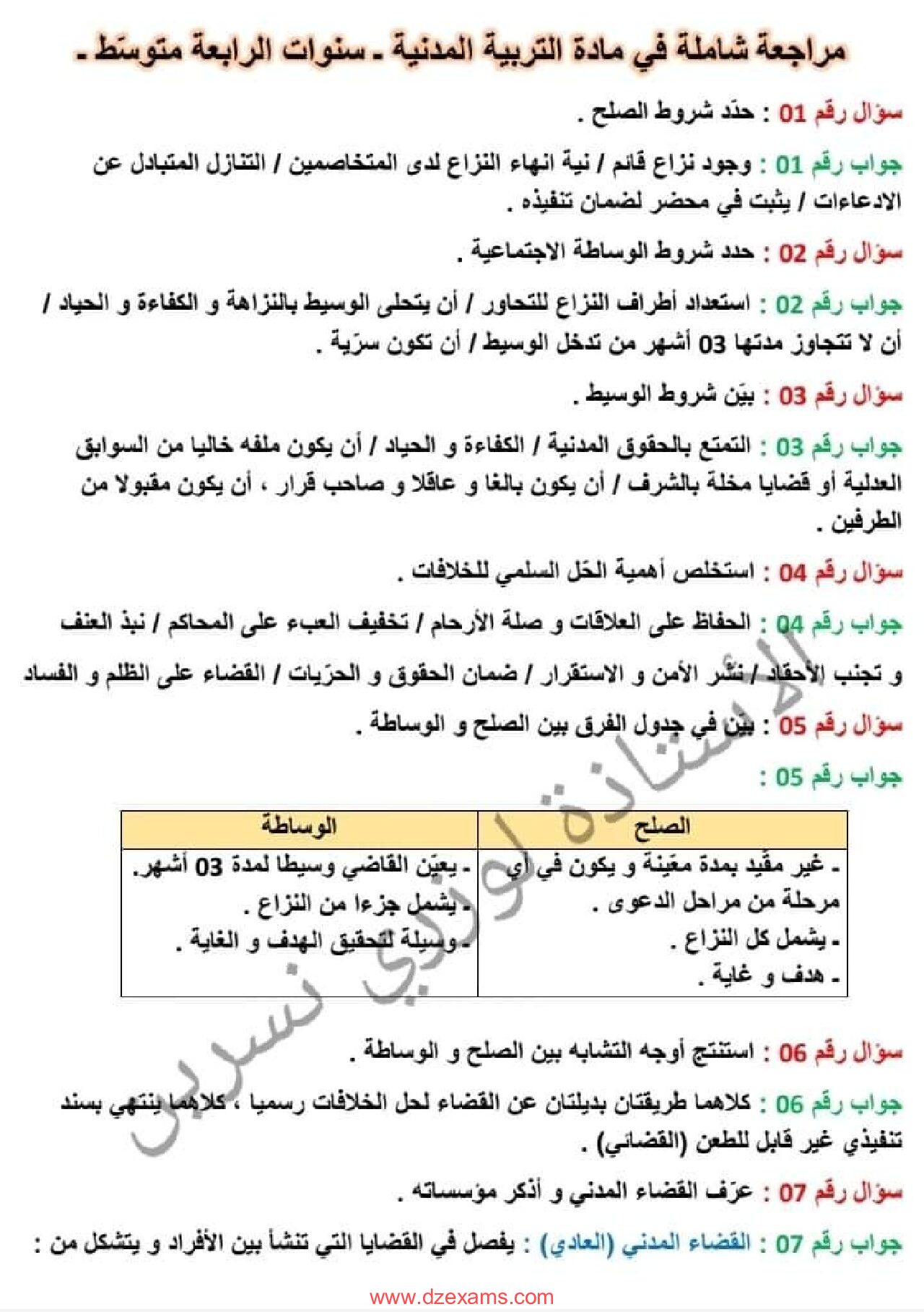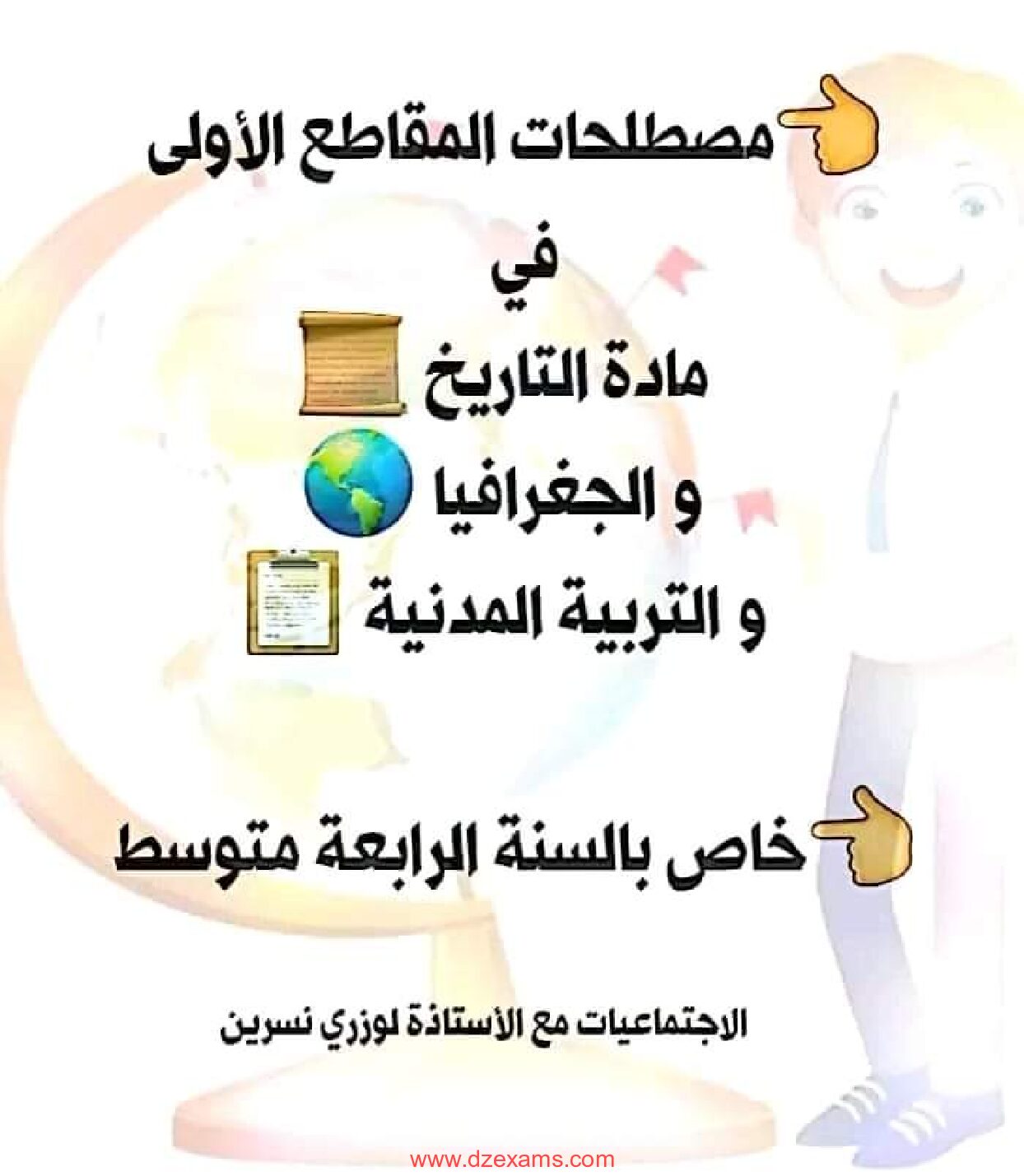 مصطلحات تواريخ معلمية و شخصيات في التاريخ و الجغرافيا و التربية المدنية للأستاذ لبصير عامر 4 متوسط 20 سؤال وجواب في التربية المدنية للأستاذ دريسي مروان 4 متوسط مادة التربية المدنية للسنة الرابعة 4 متوسط دروس مفصلة، فروض واختبارات، تمارين محلولة: مستوى السنة الرابعة متوسط لتحضير شهادة التعليم المتوسط يمكن تصفح الإختبار مباشرة عبر موقع الدراسة الجزائري أو تحميله مباشرة بصيغة …