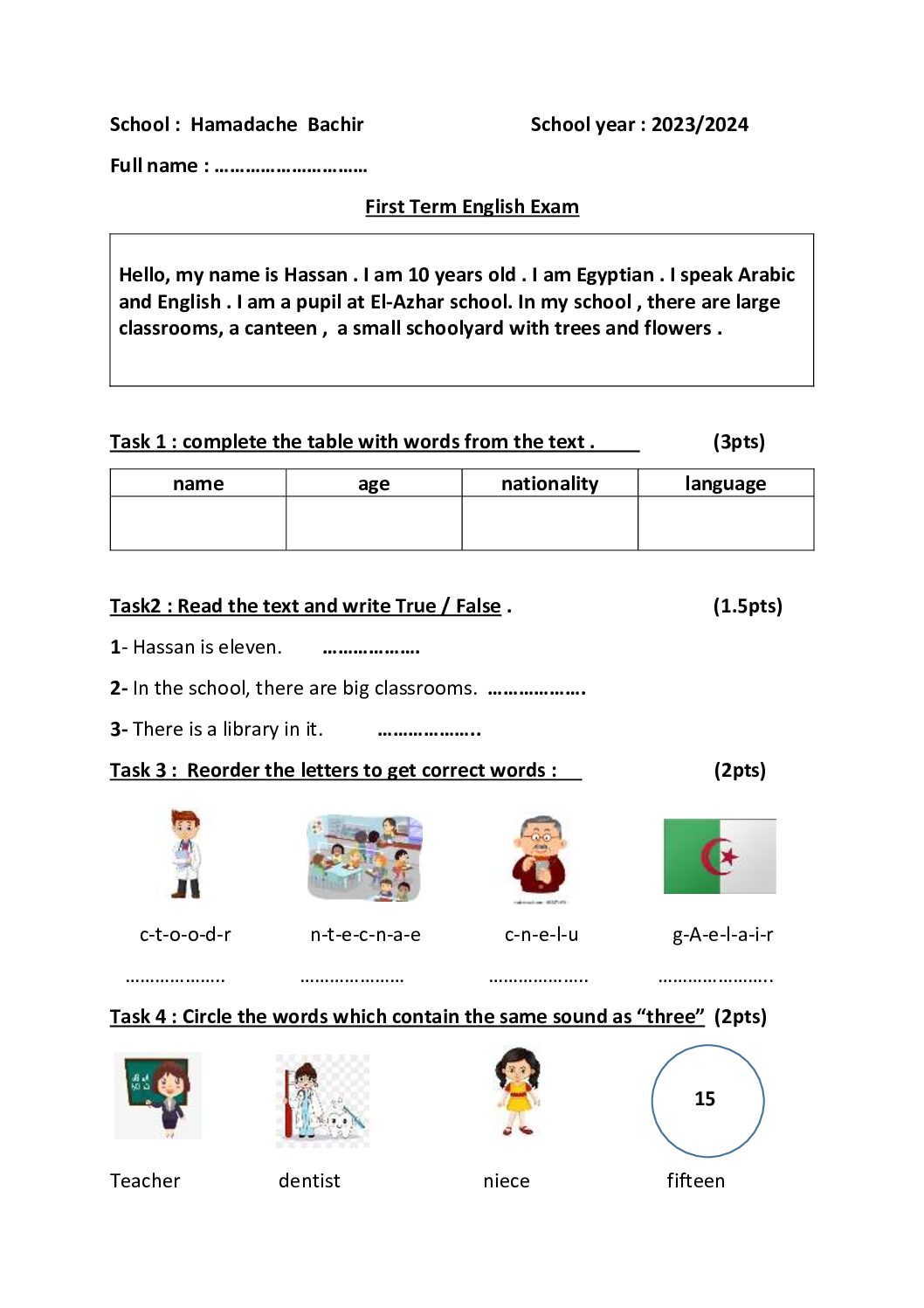 مادة اللغة الإنجليزية للسنة الرابعة ابتدائي : نموذج لإمتحان في الفصل الأول رقم 24- في مادة اللغة الإنجليزية مستوى السنة الرابعة ابتدائي الجيل الثاني ، السنة الدراسية: 2025/2026 مع التصحيح يمكن تصفح الإختبار مباشرة عبر موقع الدراسة الجزائري أو تحميله مباشرة بصيغة PDF بالضغط أعلاه على: .: تحميل :. اللغة الإنجليزية السنة الرابعة ابتدائي