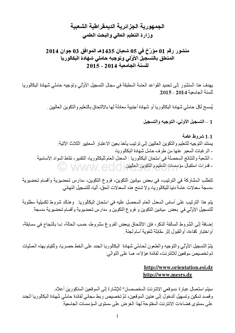 4. نسخة من المنشور رقم 01 المؤرّخ في 05 شعبان 1435هـ الموافق 03 جوان 2014 المتعلق بالتسجيل الأوّلي وتوجيه حاملي شهادة البكالوريا للسنة الجامعية 2014 – 2015.