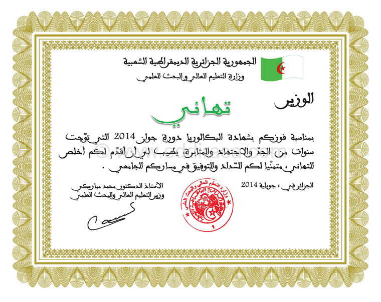 1. رسالة تهنئة شخصية من الأستاذ محمد مباركي، وزير التعليم العالي والبحث العلمي.
