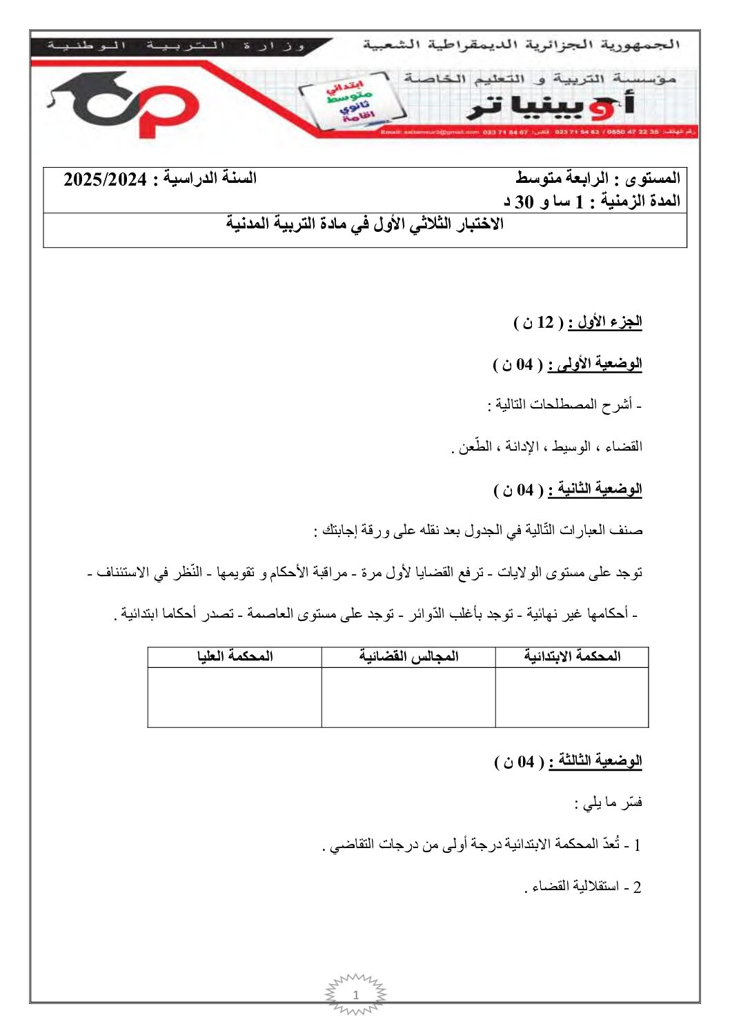 اختبارات التربية المدنية 4 متوسط الفصل الأول