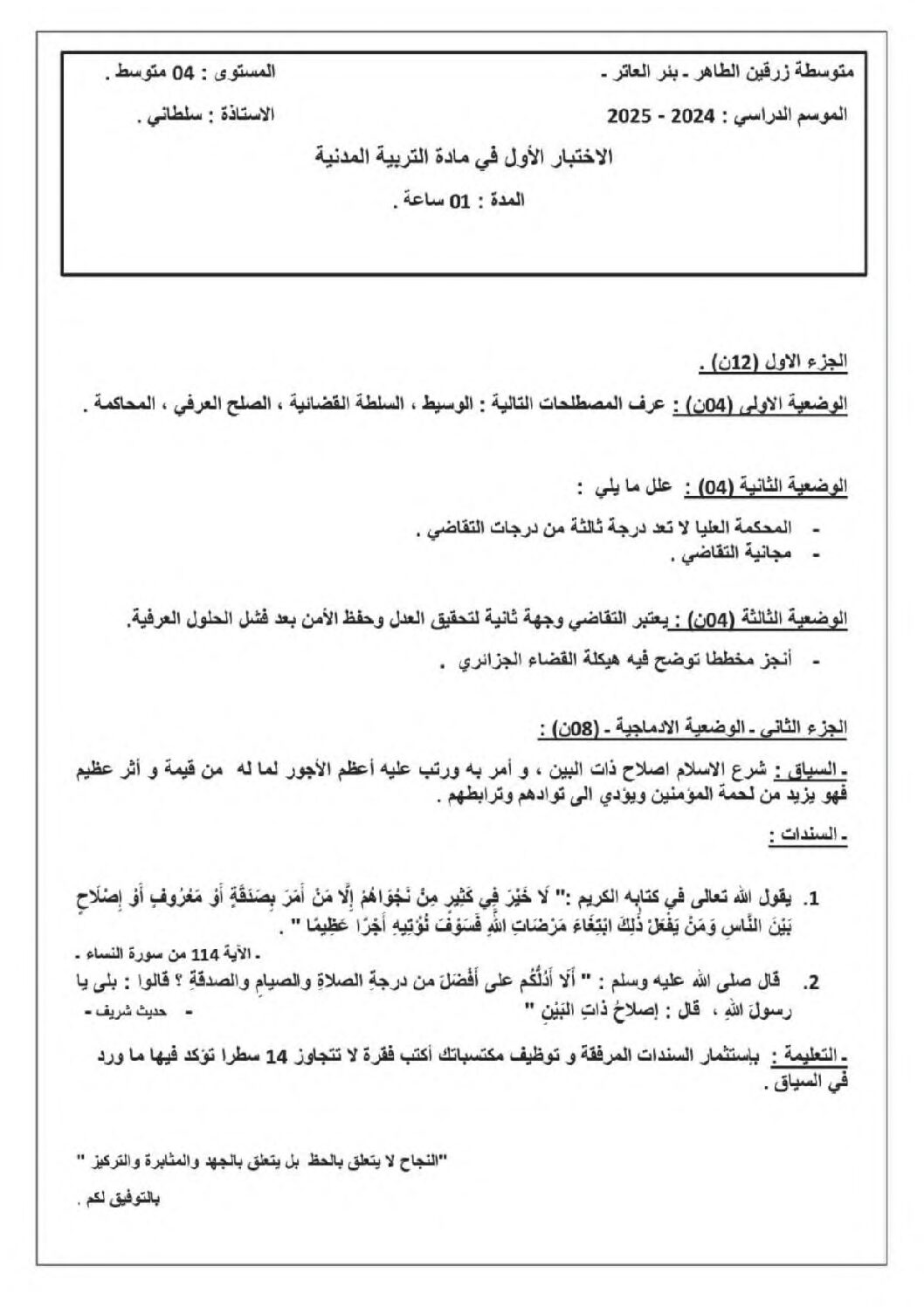 اختبار في التربية المدنية الفصل الأول السنة الرابعة متوسط رقم 73 مع التصحيح