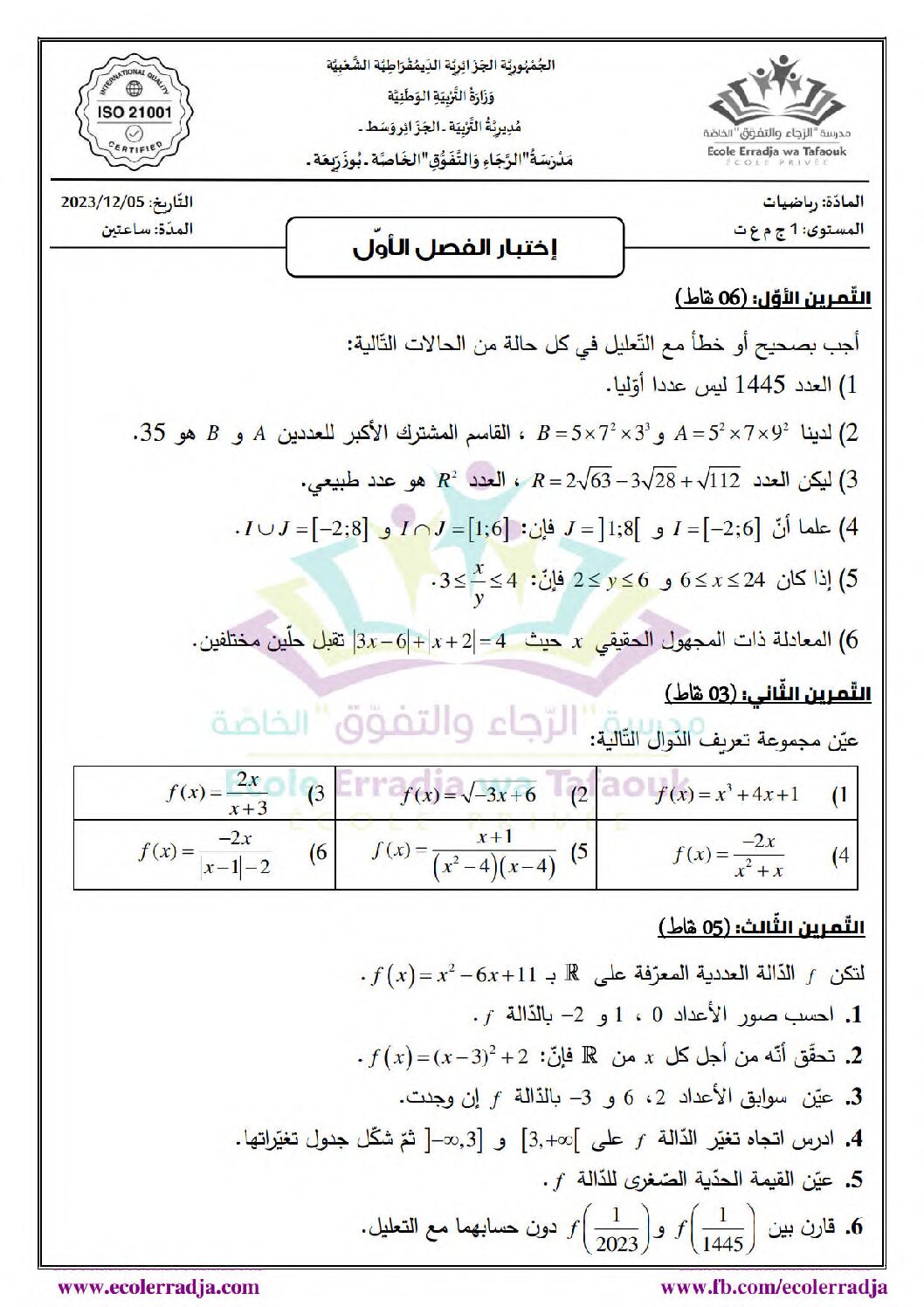 اختبار في الرياضيات الفصل الأول السنة الأولى ثانوي ج م ع رقم 75