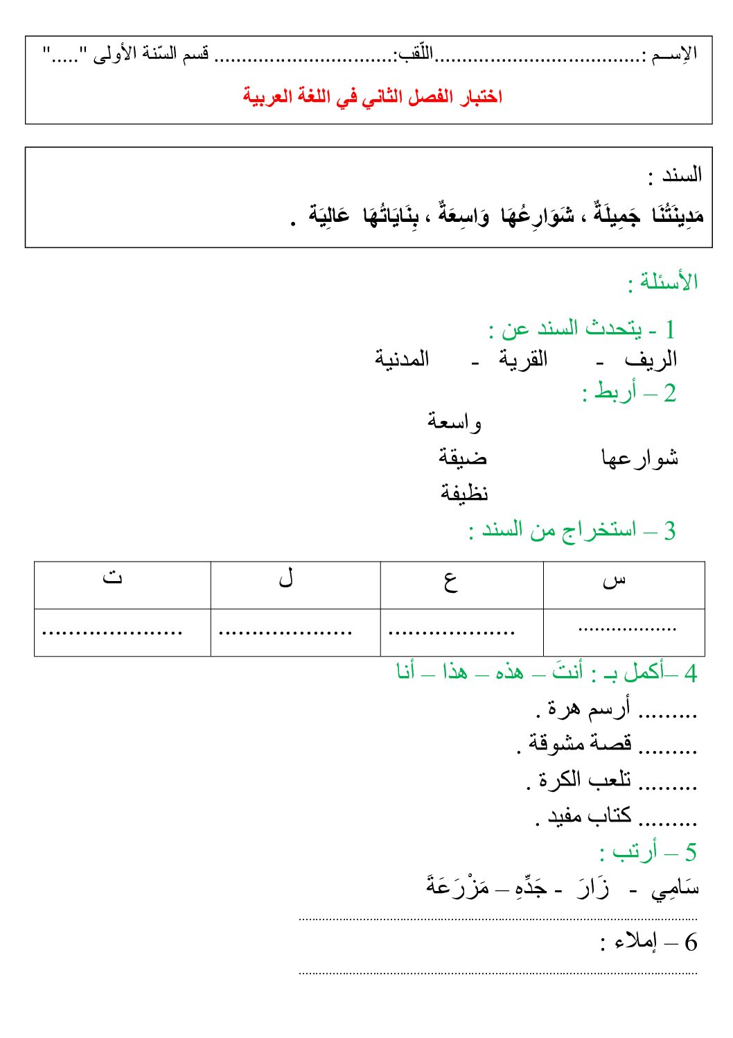 إختبار الفصل الثاني في اللغة العربية السنة الأولى ابتدائي رقم 89