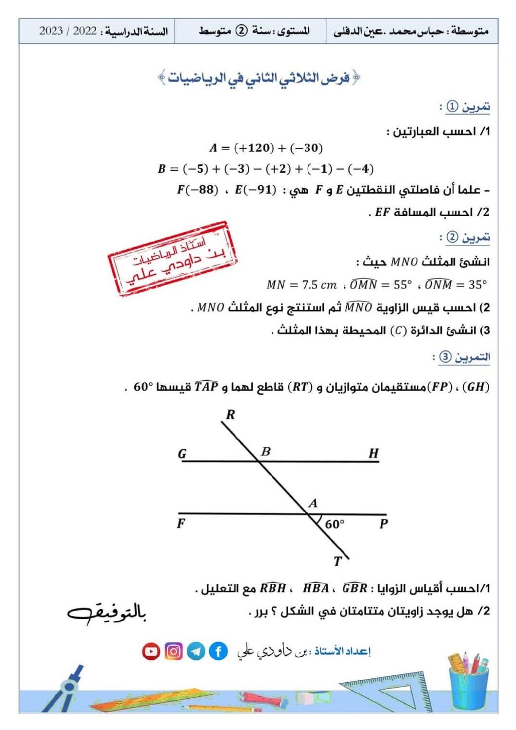 مادة الرياضيات للسنة الثانية 2 متوسط دروس مفصلة، فروض واختبارات، تمارين محلولة: نموذج لإمتحان في الفصل الثاني رقم 40- في مادة الرياضيات مستوى السنة الثانية متوسط الجيل الثاني ، السنة الدراسية: 2021/2022 مع التصحيح يمكن تصفح الإختبار مباشرة عبر موقع الدراسة الجزائري أو تحميله مباشرة بصيغة PDF بالضغط أعلاه على: .: تحميل :. الرياضيات السنة الثانية متوسط