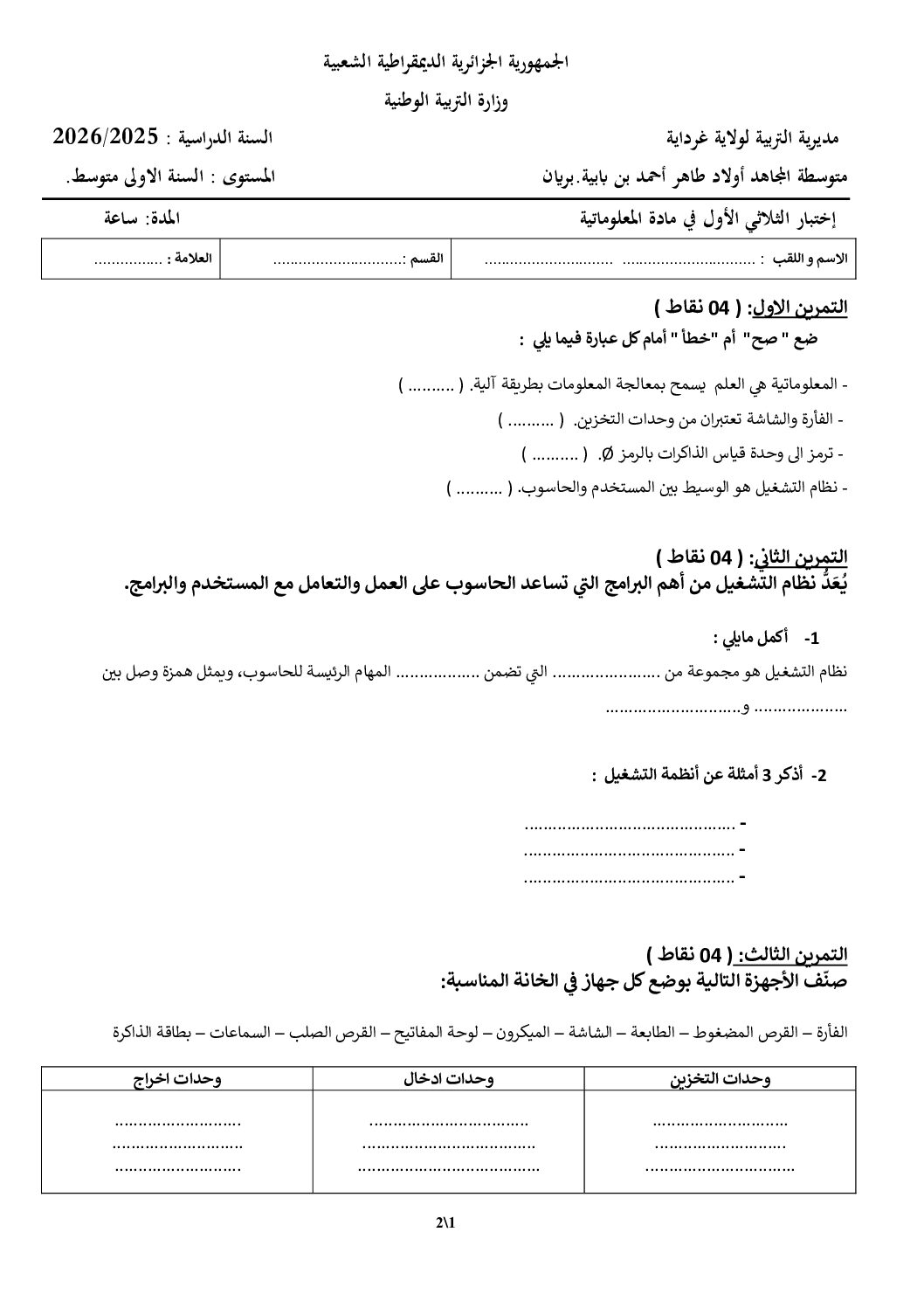 إختبار في الإعلام الآلي الفصل الأول السنة الأولى متوسط رقم 44