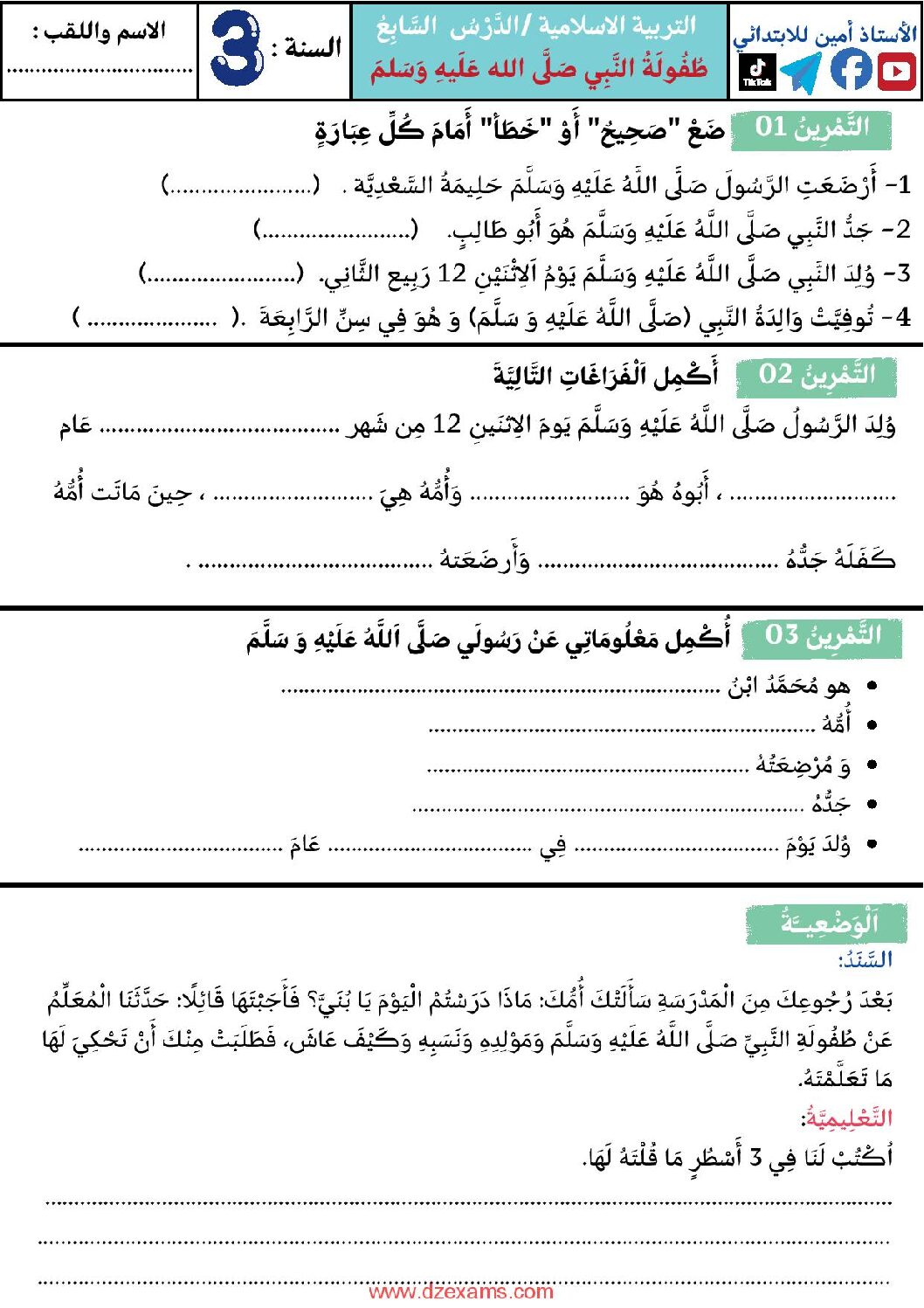إختبار الفصل الأول في التربية الإسلامية السنة الثالثة ابتدائي رقم 89