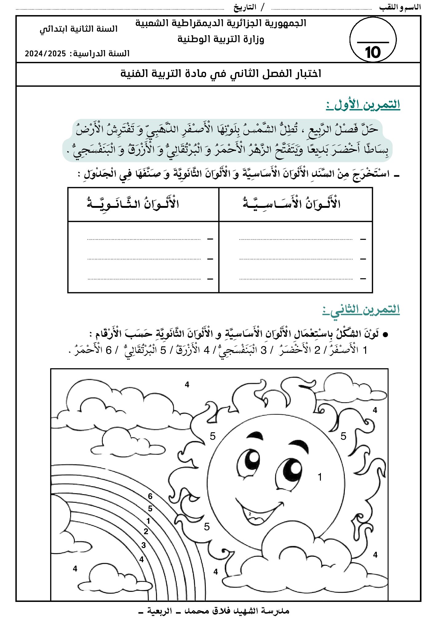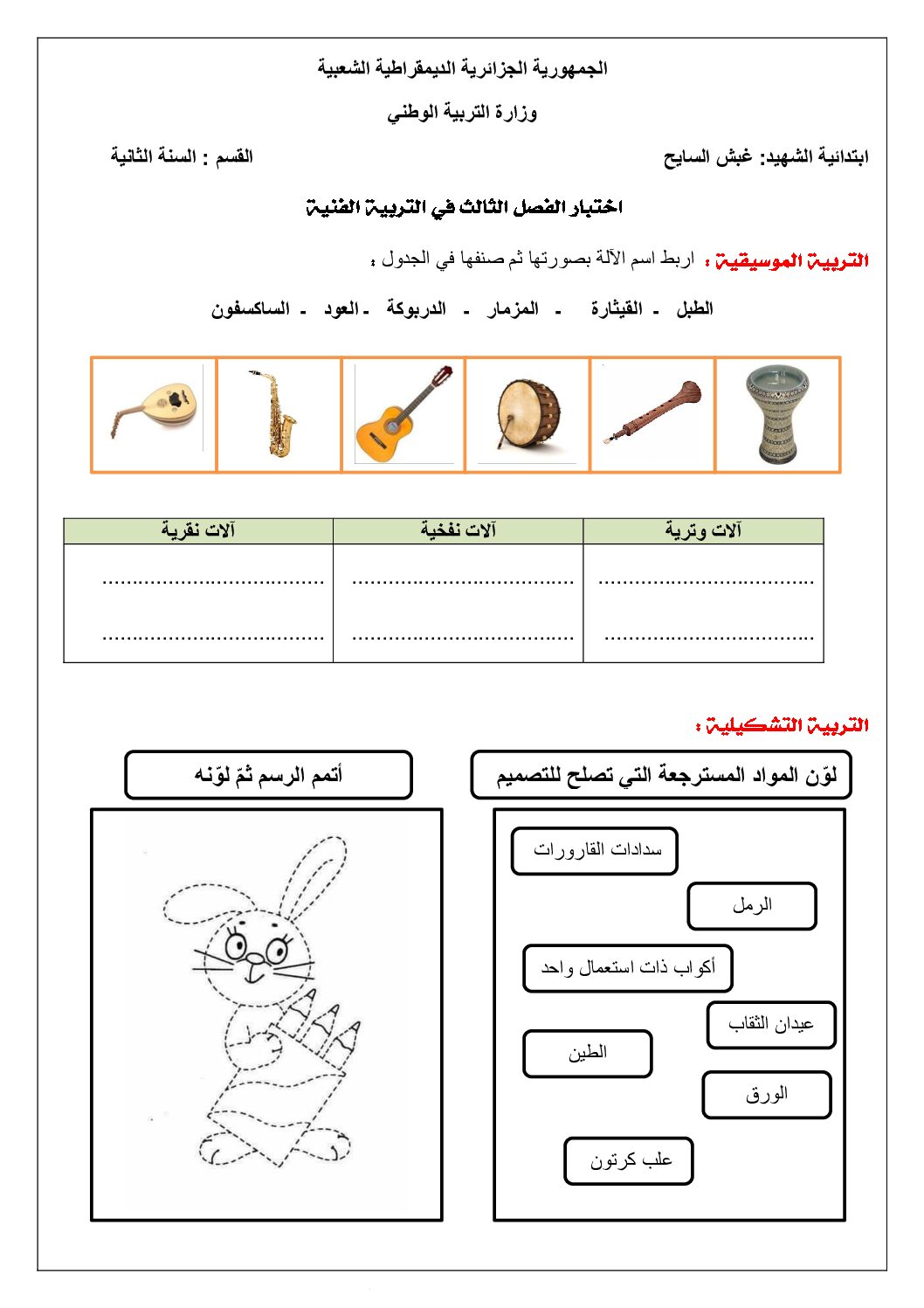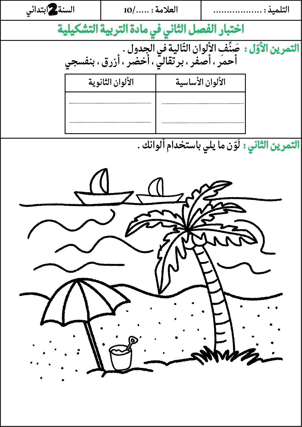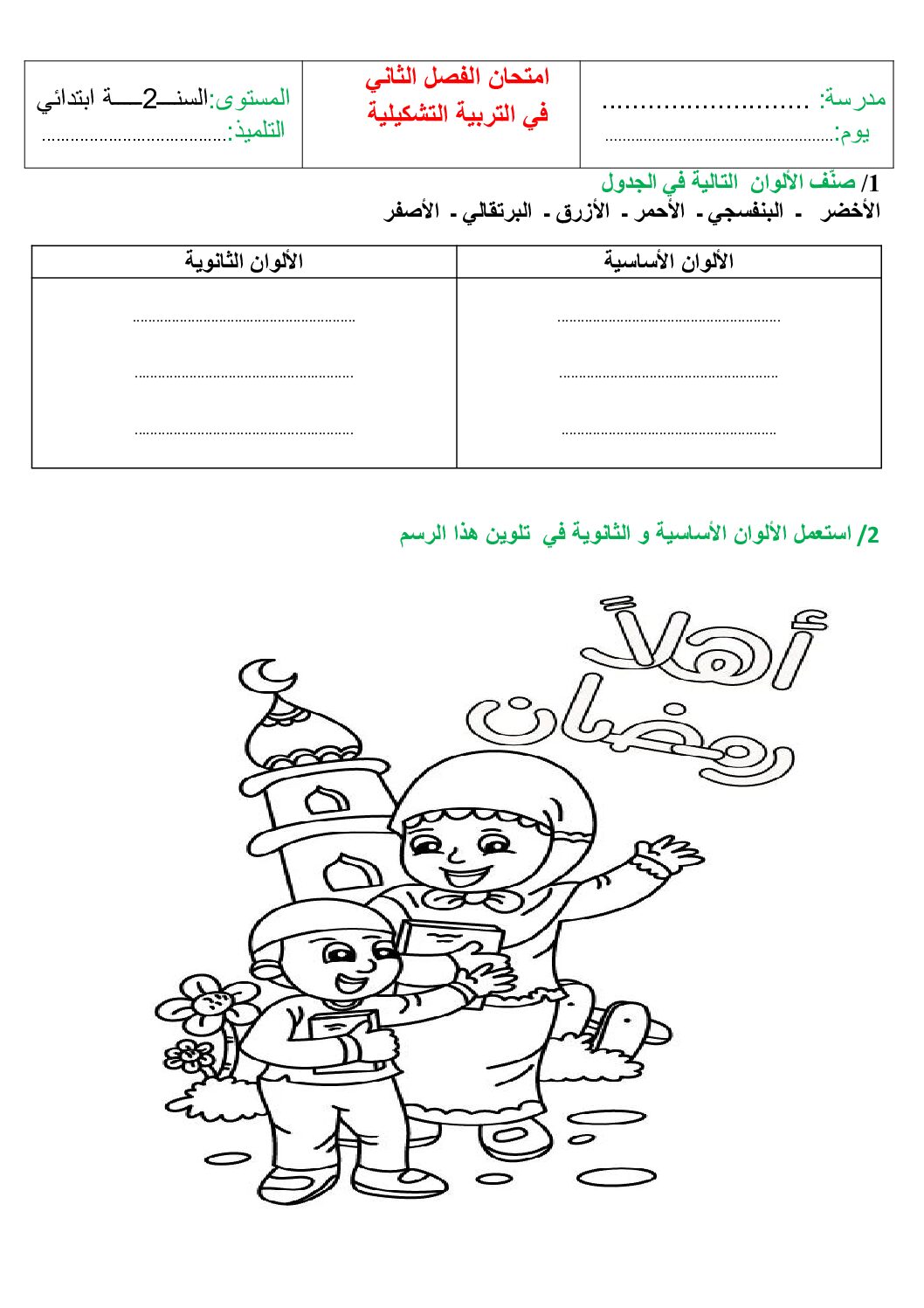 إختبار في التربية الفنية السنة الثانية ابتدائي رقم 69 مع التصحيح