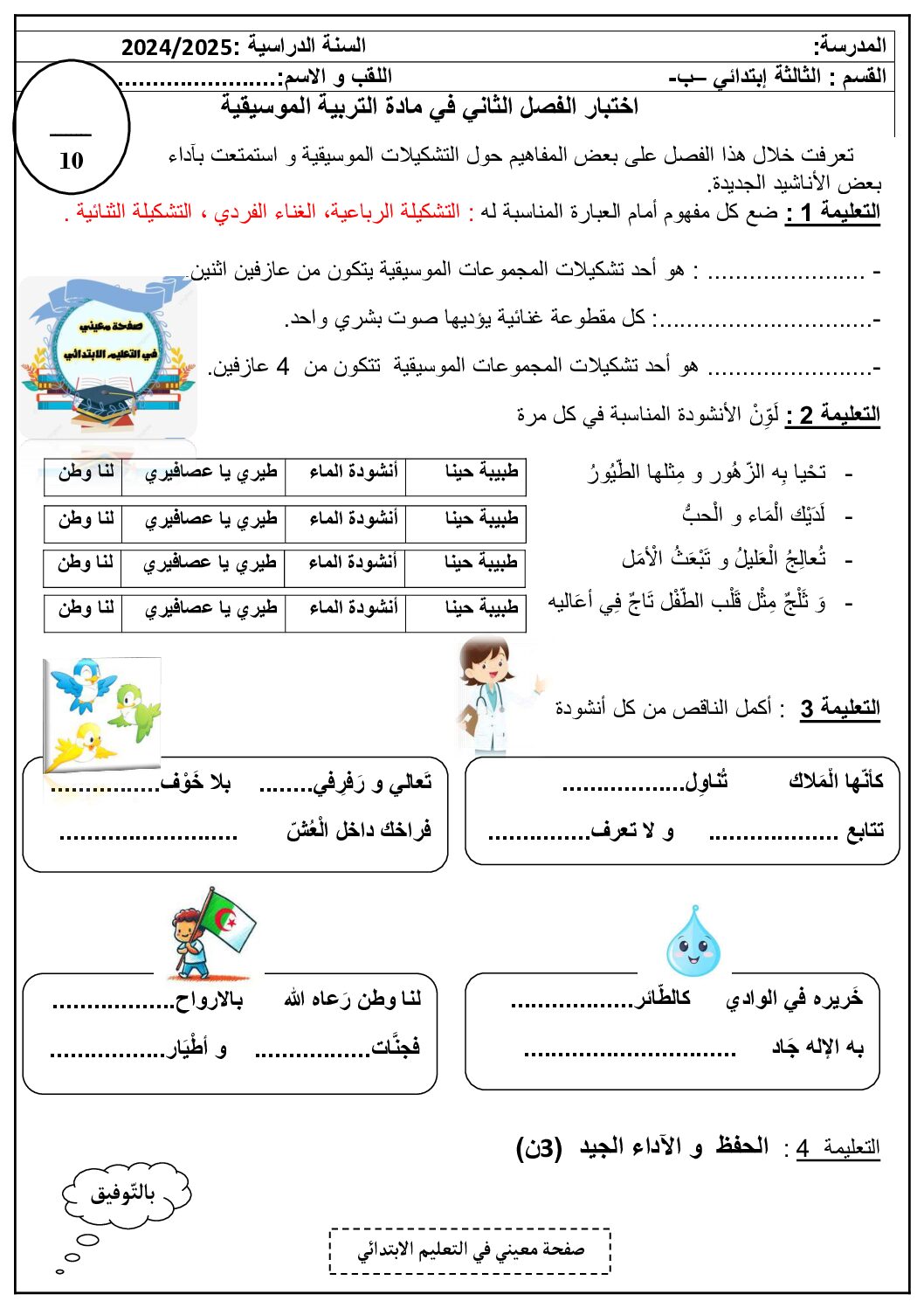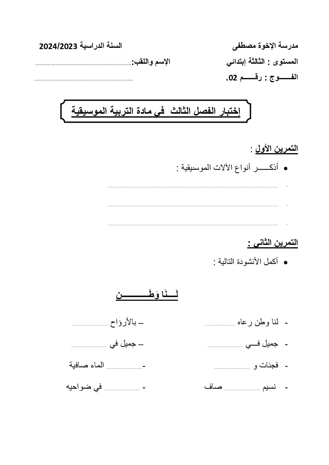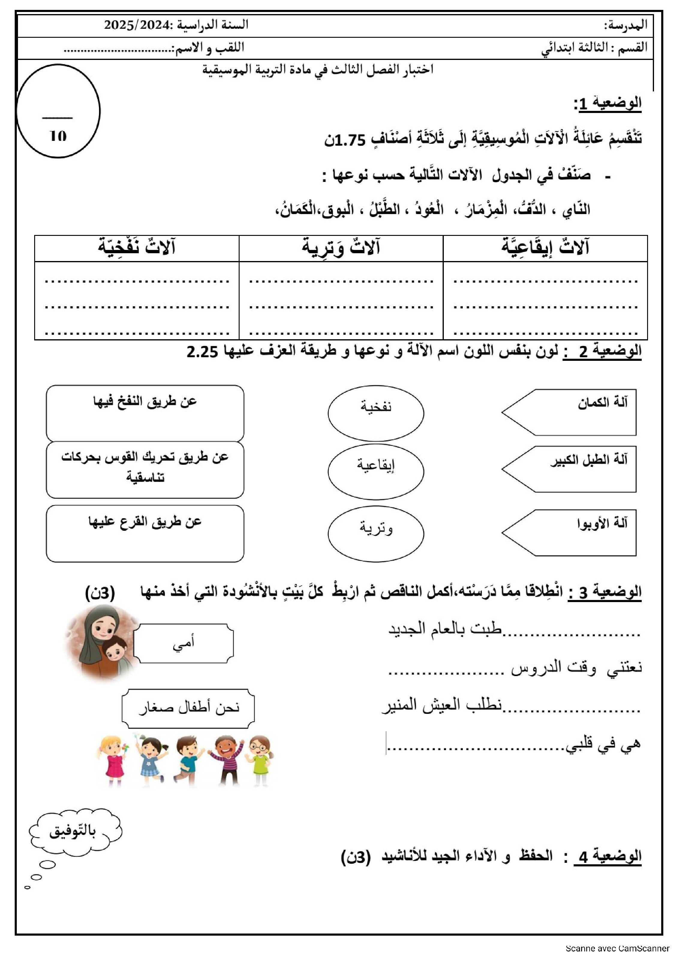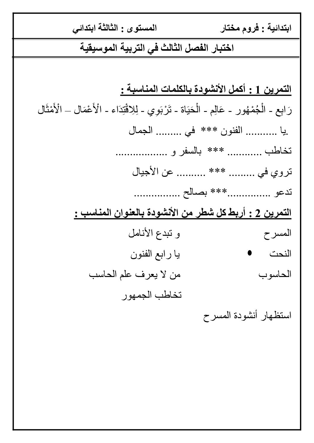 إختبار في التربية الموسيقية السنة الثالثة ابتدائي رقم 16