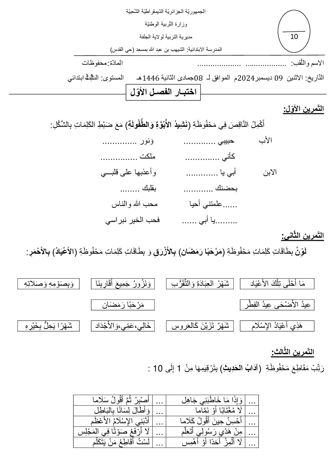 مادة التربية الموسيقية للسنة الثالثة ابتدائي : نموذج لإمتحان في الفصل الثاني رقم 15- في مادة التربية الموسيقية والمحفوظات مستوى السنة الثالثة ابتدائي الجيل الثاني ، السنة الدراسية: 2025/2026 مع التصحيح يمكن تصفح الإمتحان مباشرة عبر موقع الدراسة الجزائري أو تحميله مباشرة بصيغة PDF بالضغط أعلاه على: .: تحميل :.