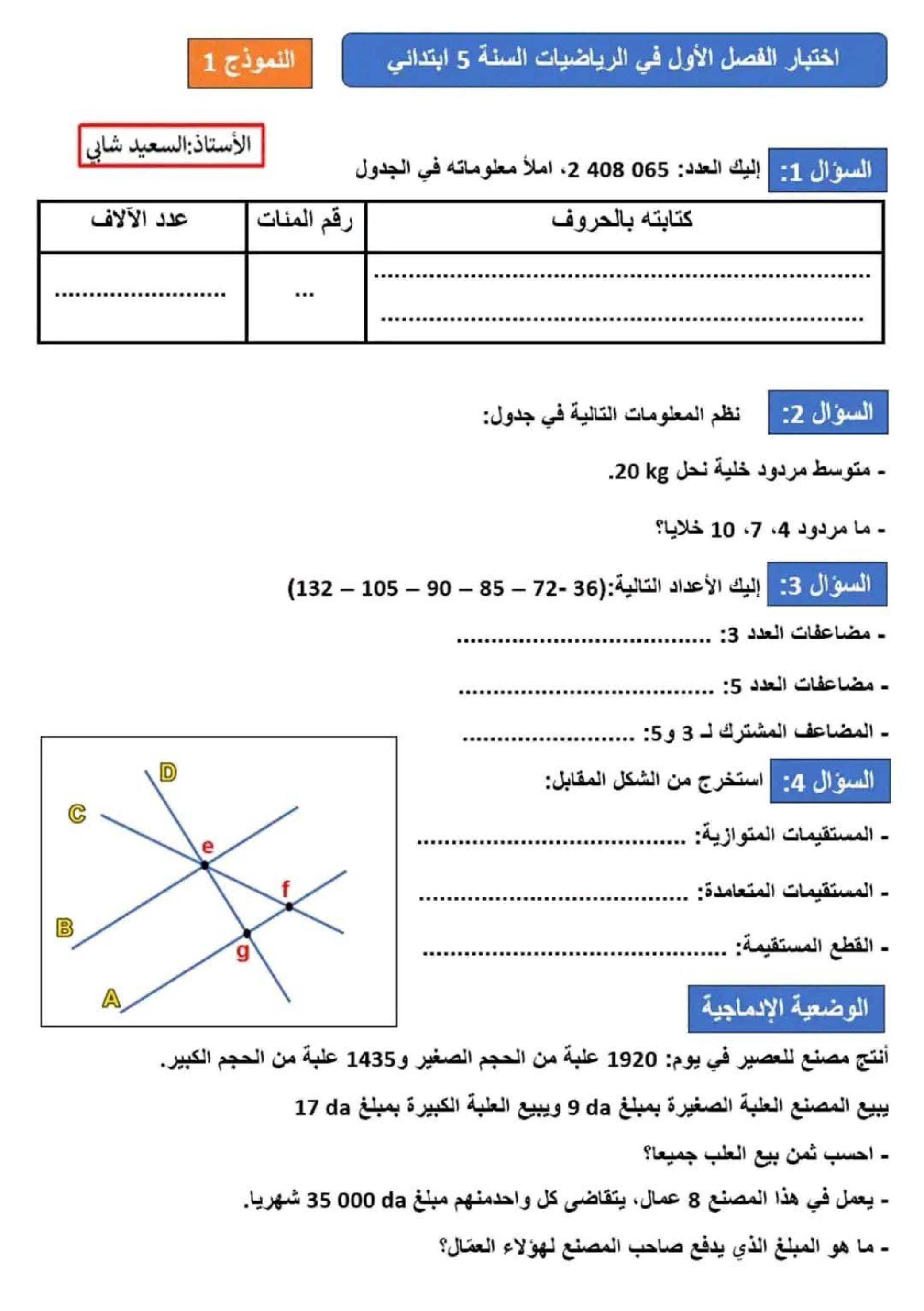 إختبار الفصل الأول في الرياضيات السنة الخامسة ابتدائي رقم 143