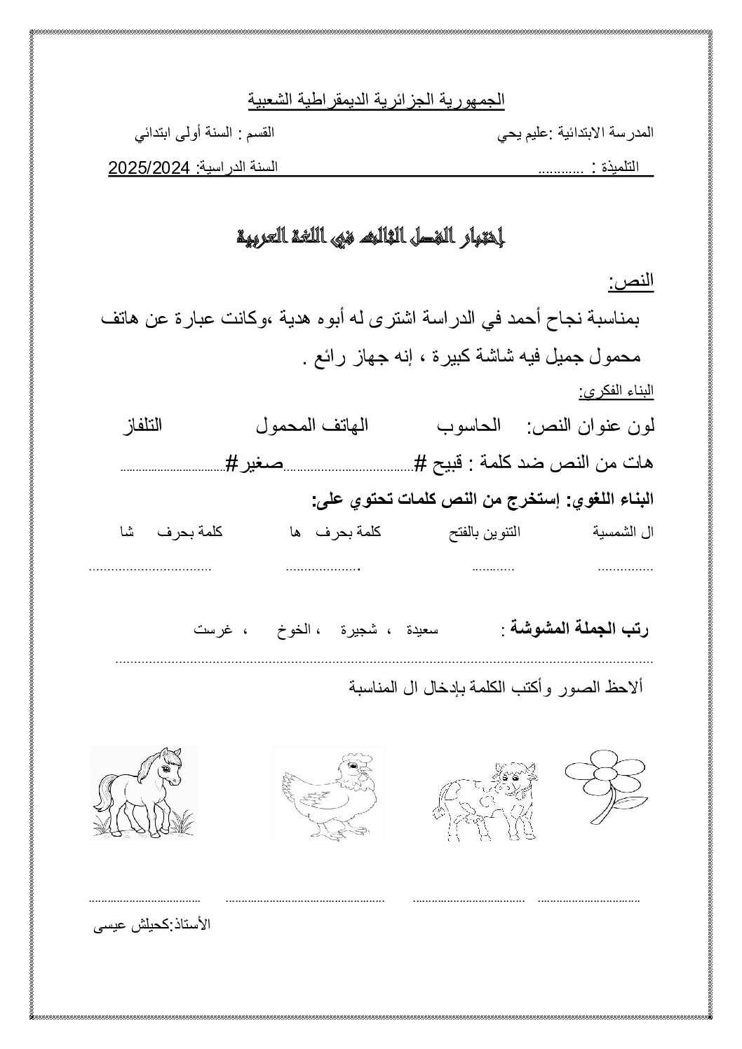 إختبار الفصل الثالث في اللغة العربية السنة الأولى ابتدائي رقم 47