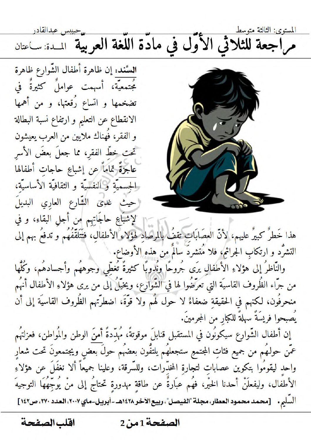 اختبار في اللغة العربية الفصل الأول السنة الثالثة متوسط رقم 79