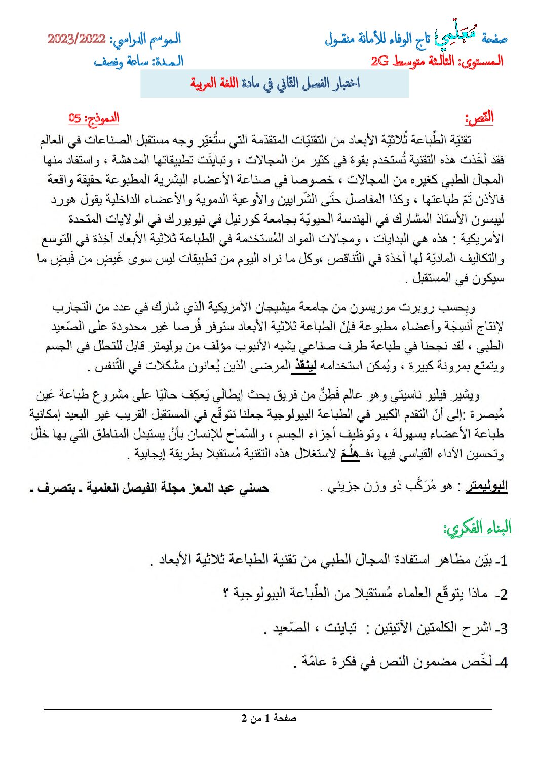 اختبار في اللغة العربية الفصل الثاني السنة الثالثة متوسط رقم 59