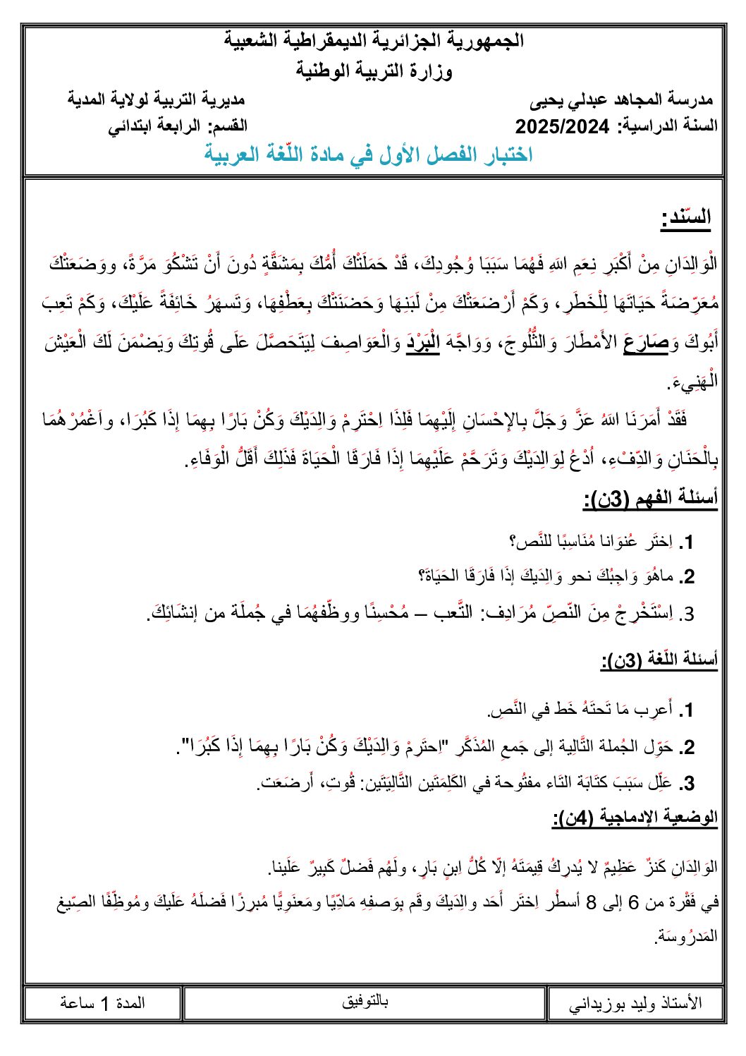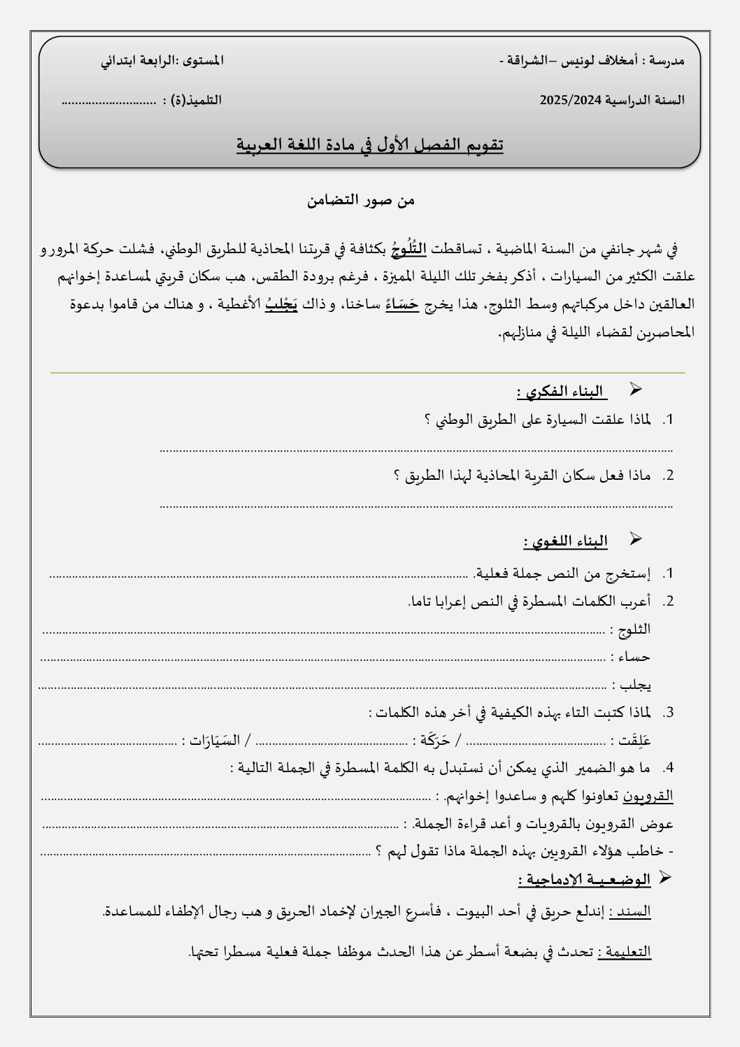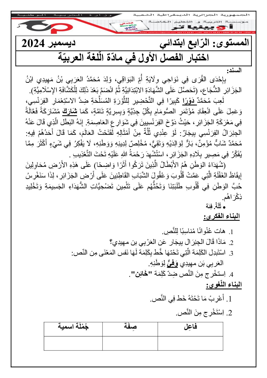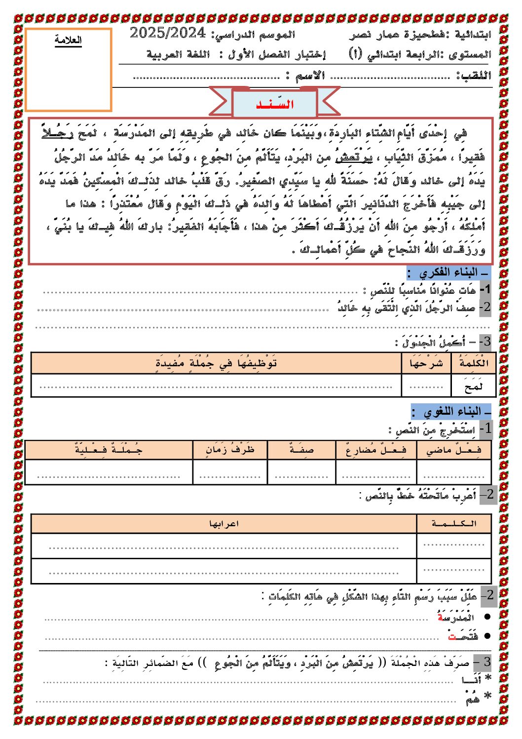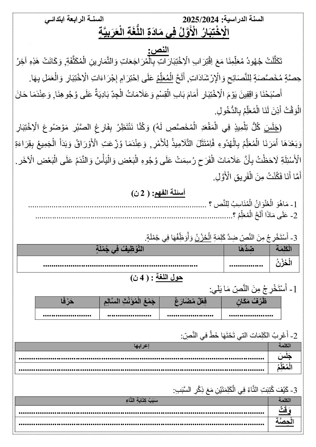إختبار الفصل الأول في اللغة العربية السنة الرابعة ابتدائي رقم 115