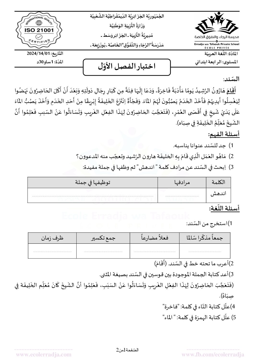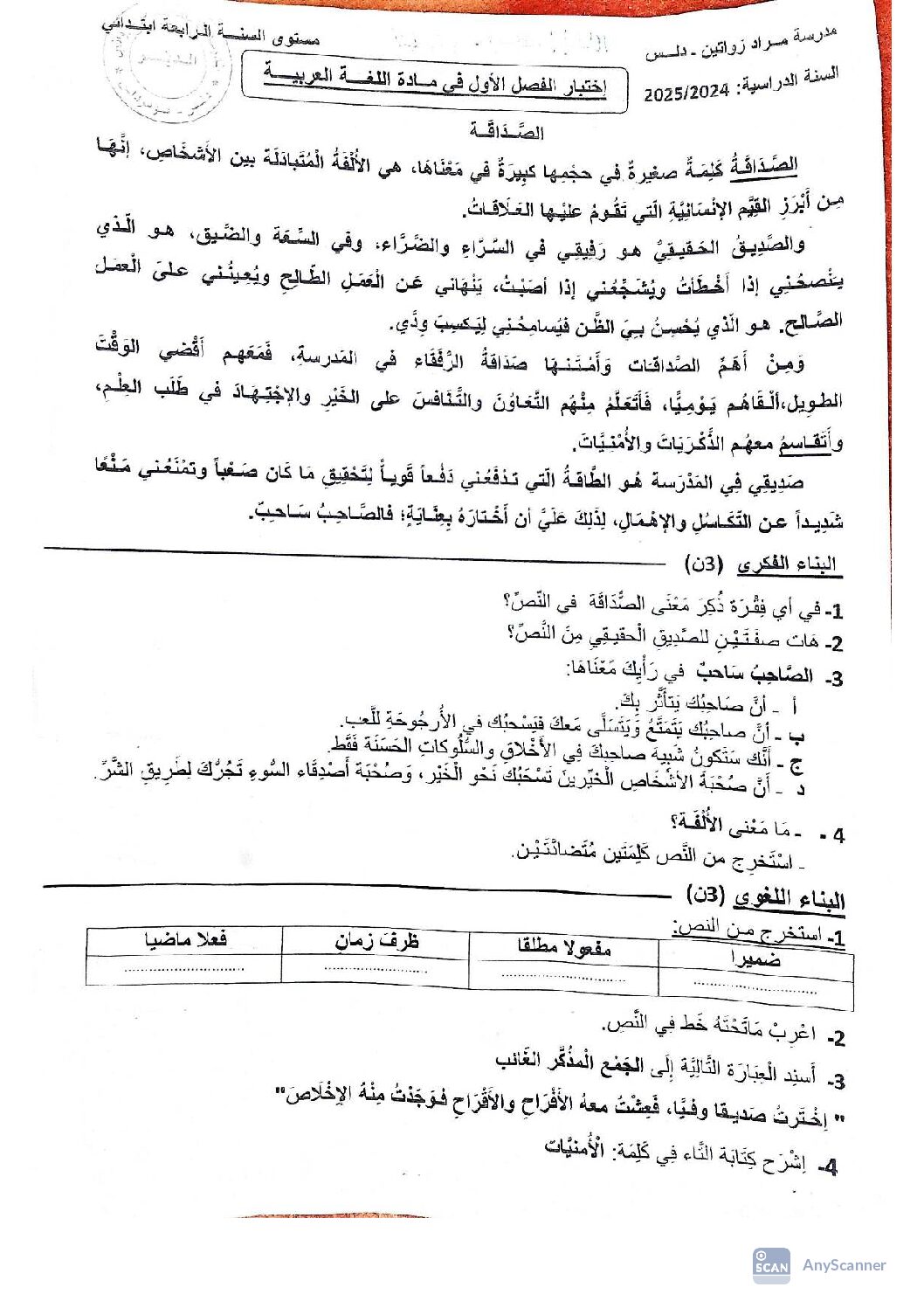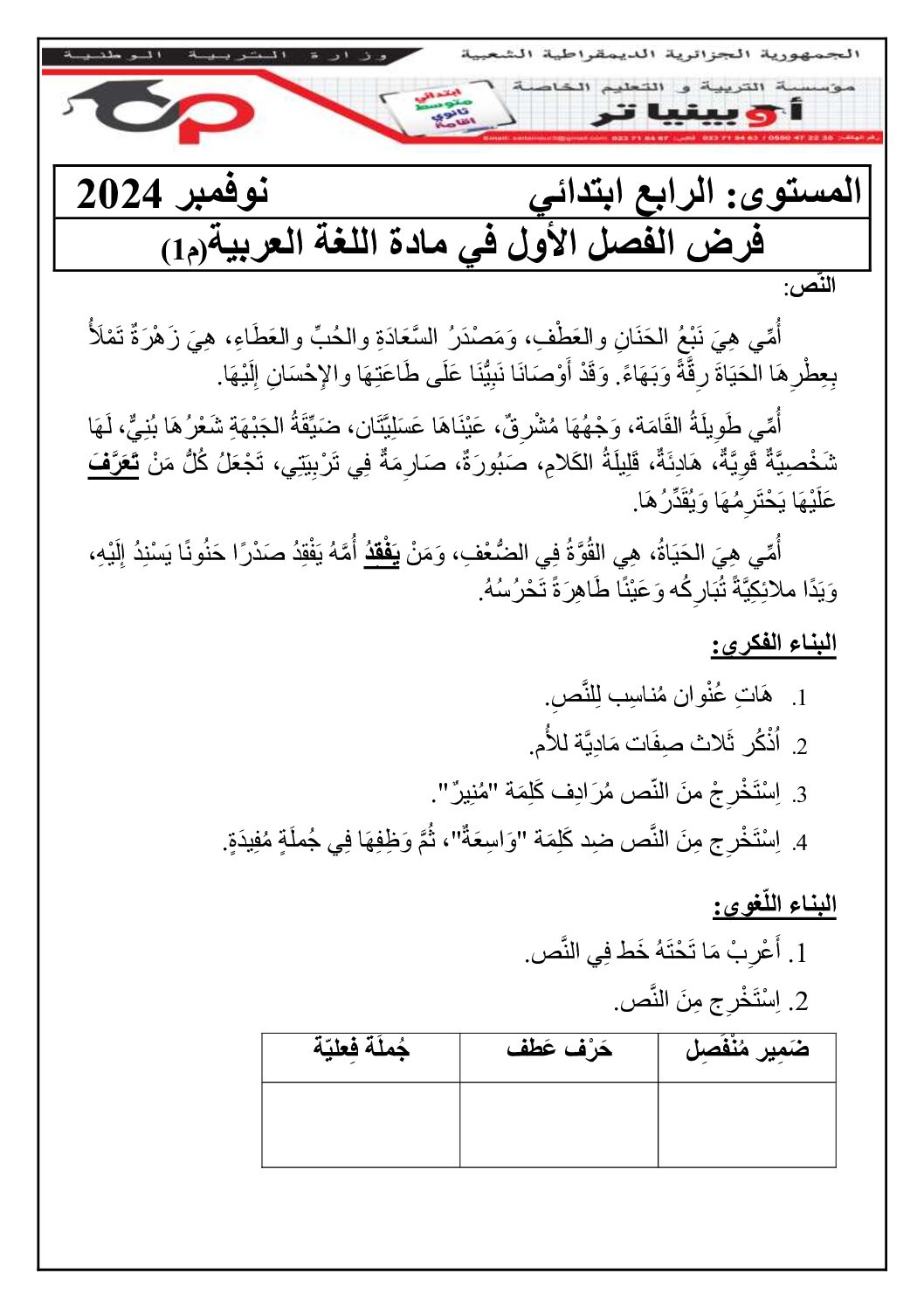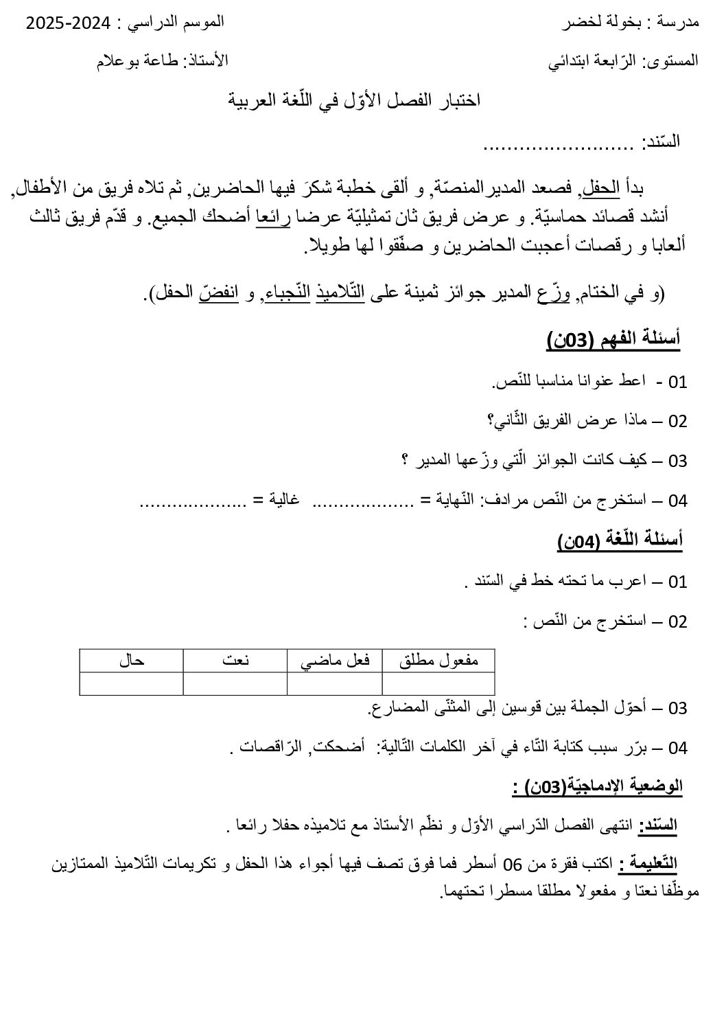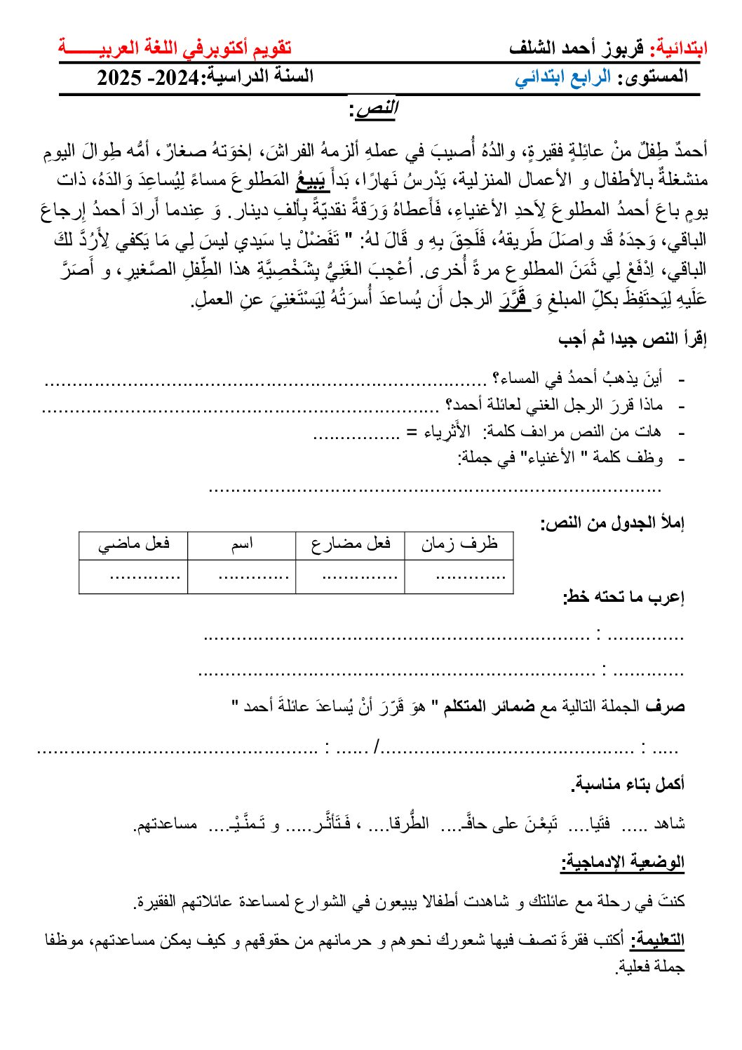 إختبار الفصل الأول في اللغة العربية السنة الرابعة ابتدائي رقم 115