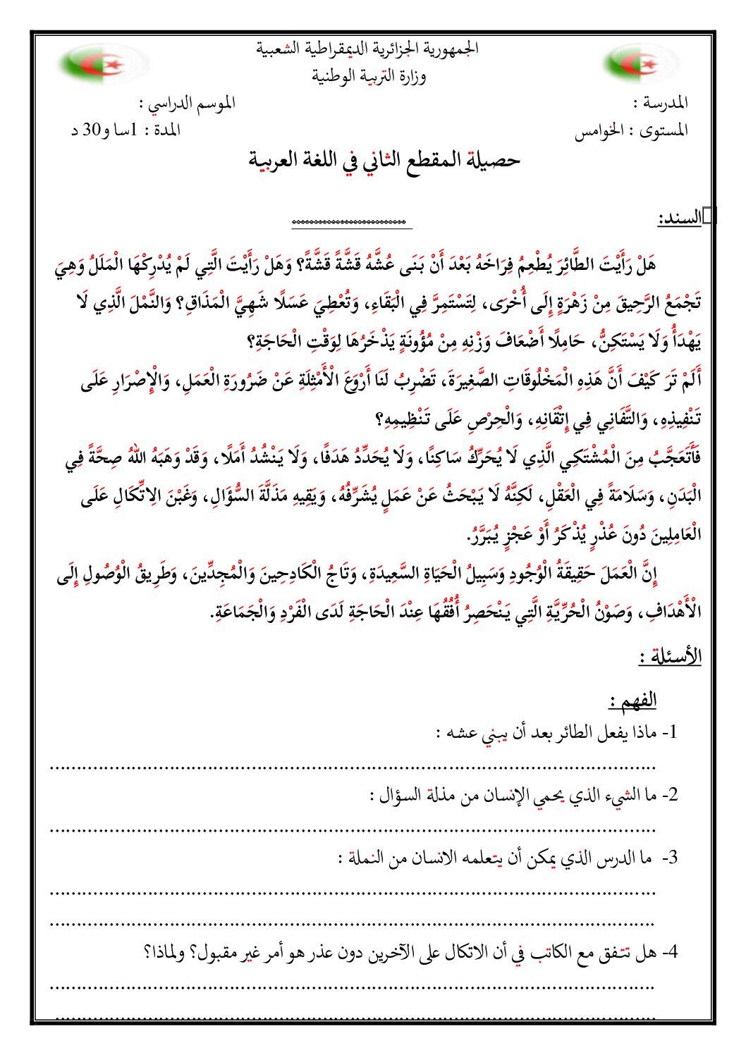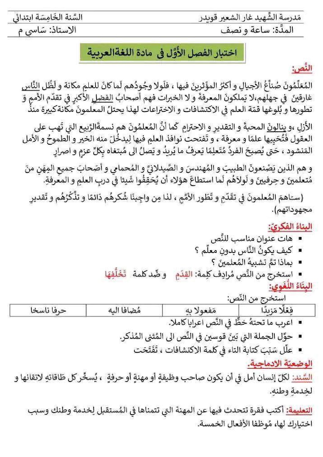 إختبار الفصل الأول في اللغة العربية السنة الخامسة ابتدائي رقم 134 مع التصحيح