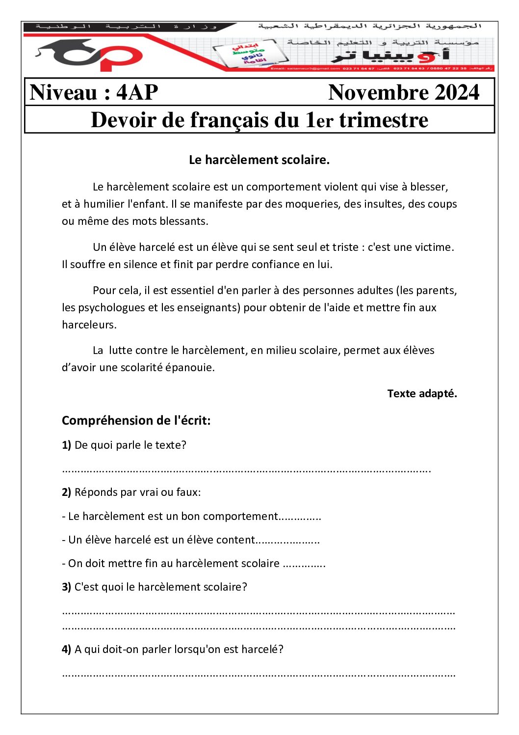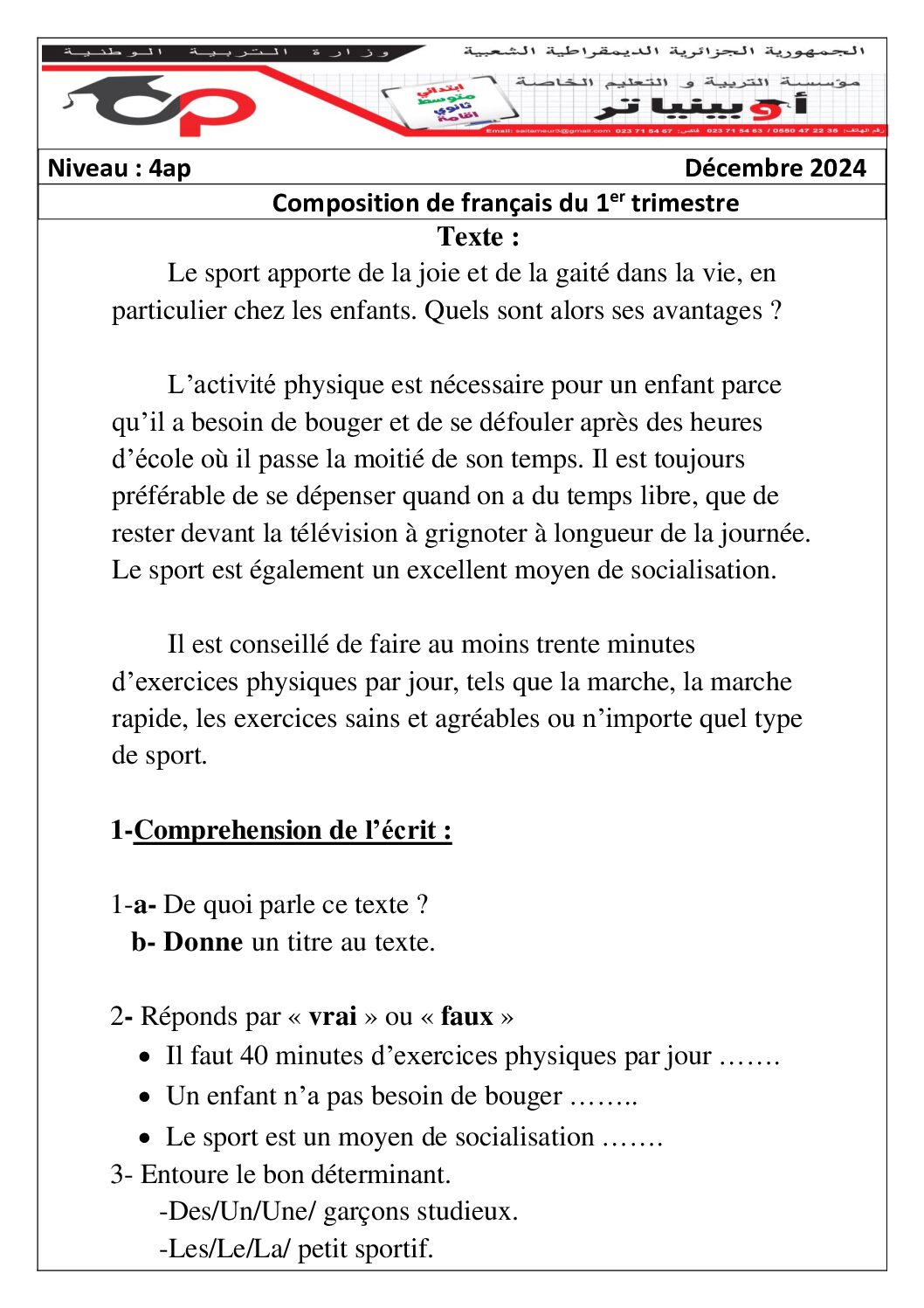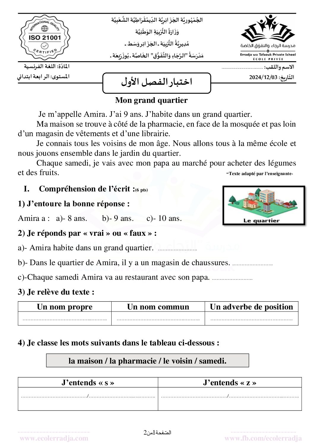 إختبار الفصل الأول في اللغة الفرنسية السنة الرابعة ابتدائي رقم 93 مع التصحيح
