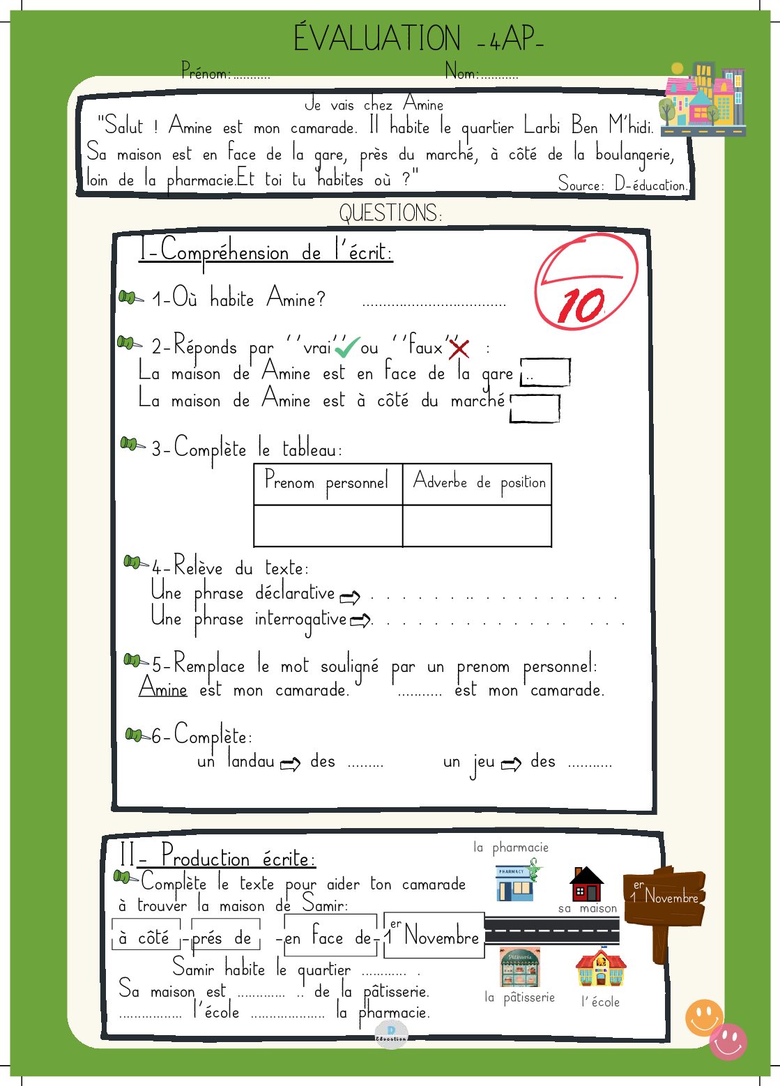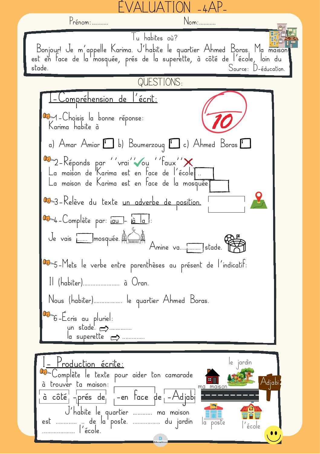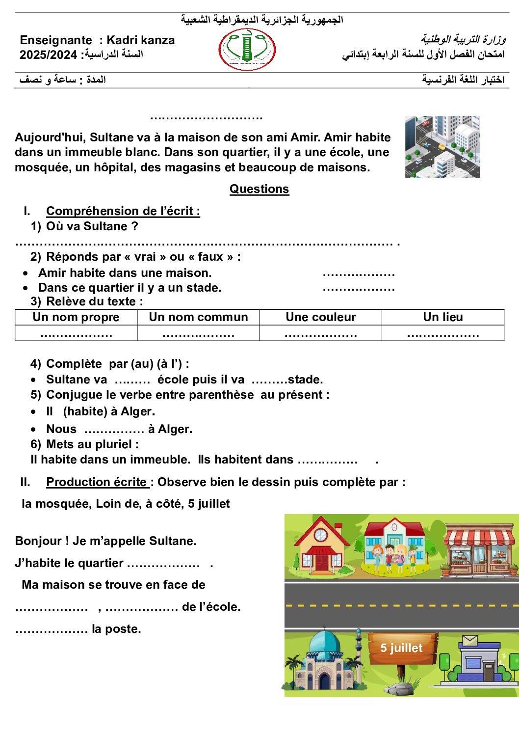 إختبار الفصل الأول في اللغة الفرنسية السنة الرابعة ابتدائي رقم 93 مع التصحيح