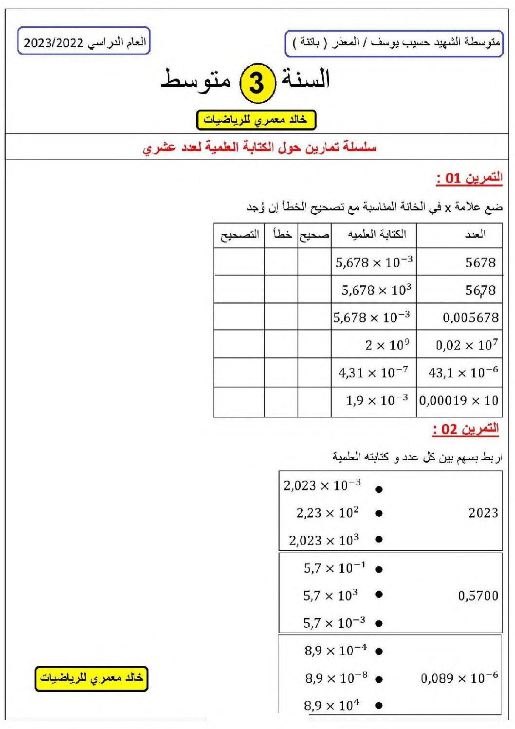 سلسلة تمارين مرفقة بالحل حول الكتابة العلمية لعدد عشري للاستاذ حالد معمري 3 متوسط 25 سؤال مرفق بالحل في الباب الأول الأعداد النسبية في الرياضيات 3 متوسط كتاب أنشطة مكيفة لجميع المقاطع التعليمية في مادة الرياضيات 3 متوسط مادة الرياضيات للسنة الثالثة 3 متوسط دروس مفصلة، فروض واختبارات، تمارين محلولة: ملخص دروس المقطع 3 القوى في مادة الرياضيات 3 متوسط …