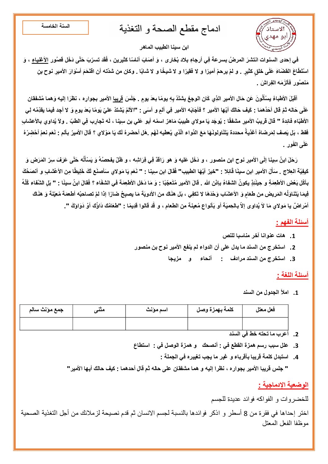 ادماج مقطع الصحة والتغذية مع الحل 5 ابتدائي