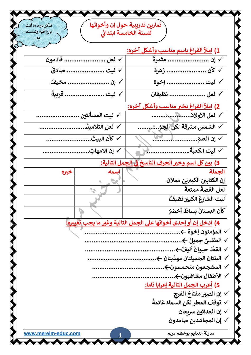 أكمل القراءة »تمارين تدريبية حول إن وأخواتها مع الحل للأستاذة مريم بوخشم 5 ابتدائي