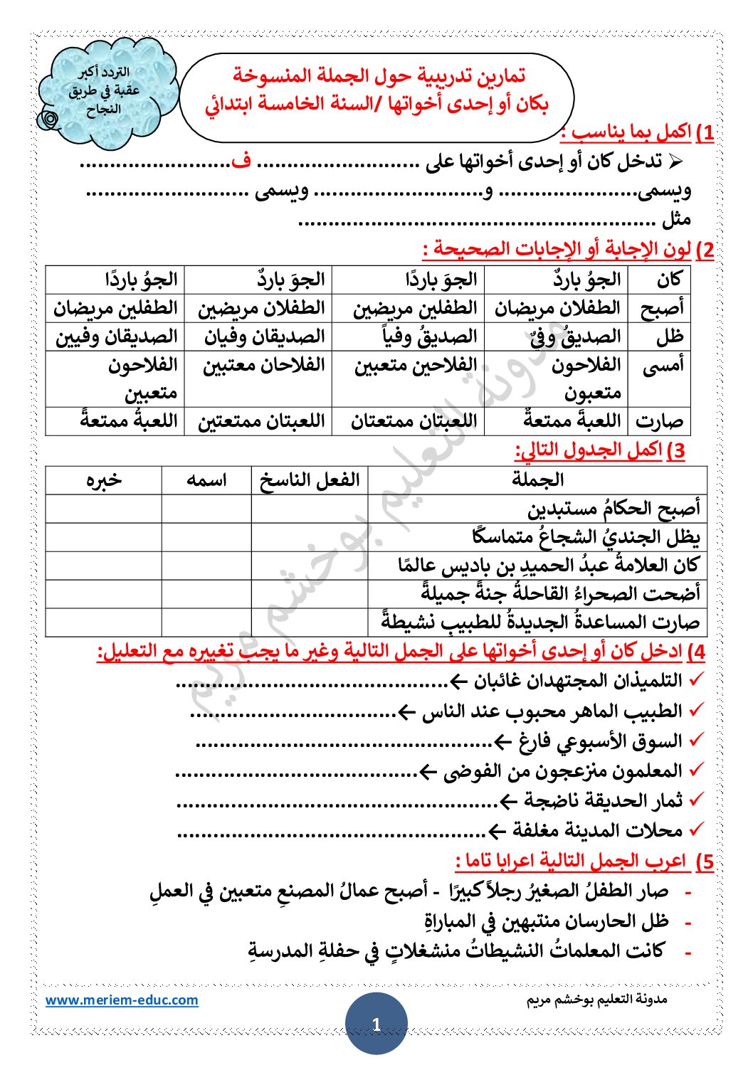 أكمل القراءة »تمارين تدريبية حول الجملة المنسوخة بكان و أخواتها مع الحل للأستاذة مريم بوخشم 5 ابتدائي