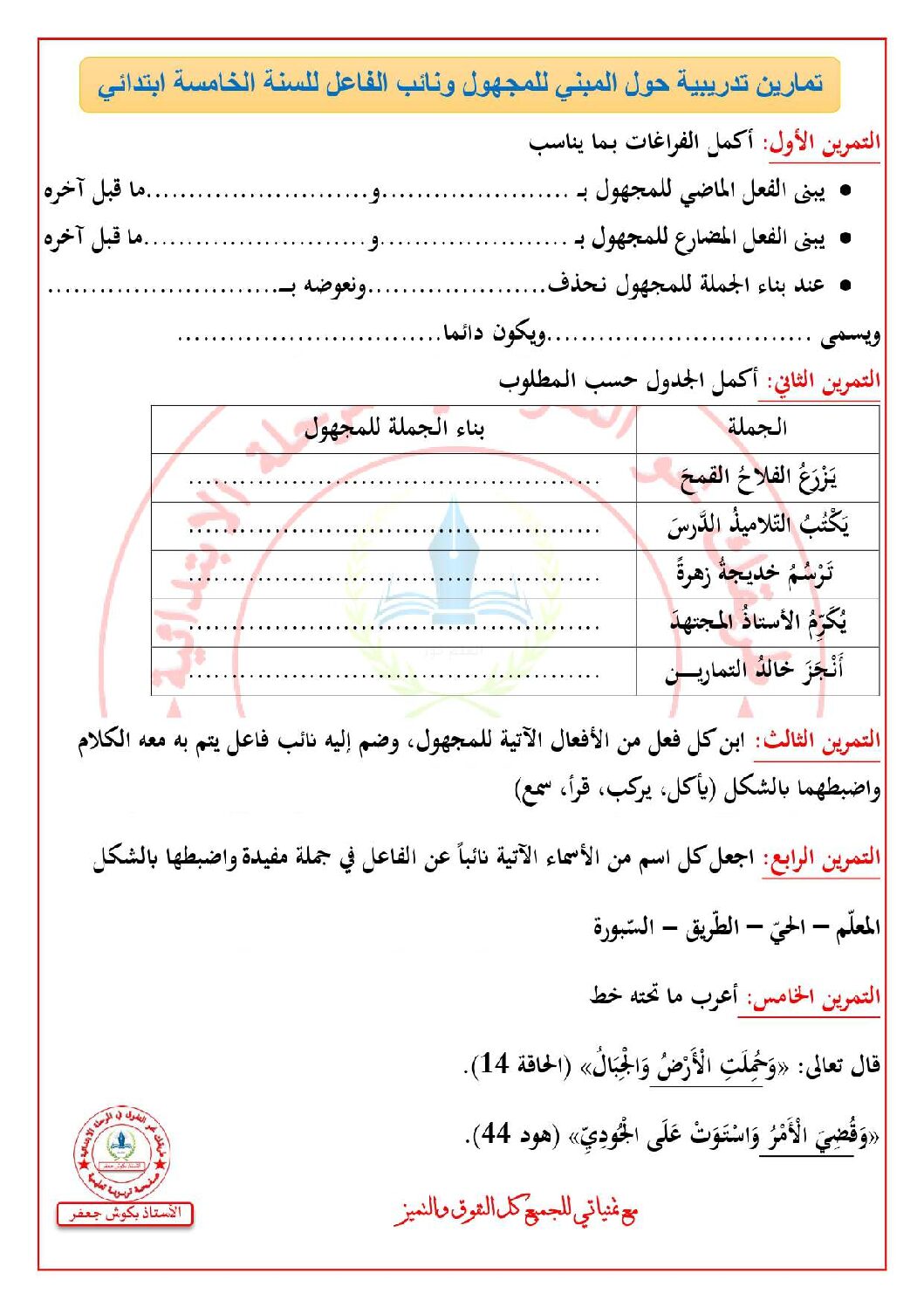 أكمل القراءة »تمارين تدريبية حول المبني للمجهول ونائب الفاعل مع الحل للأستاذ بكوش جعفر 5 ابتدائي