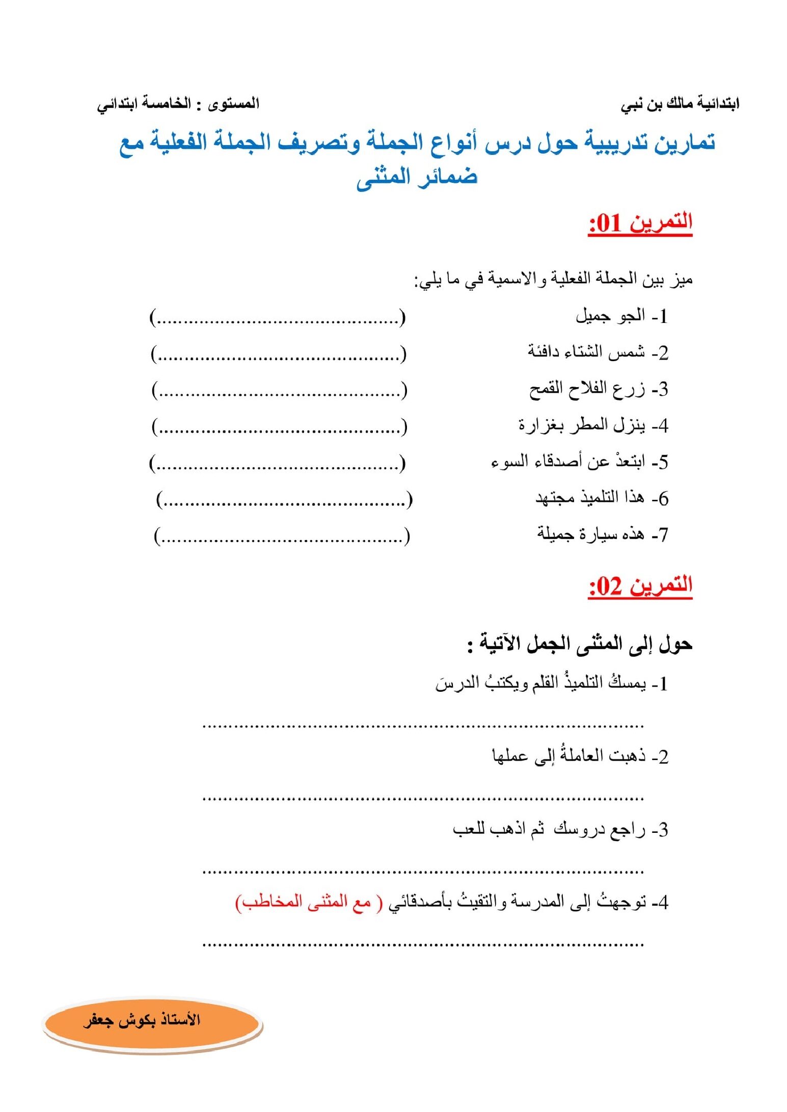 أكمل القراءة »تمارين حول أنواع الجملة وتصريف الجملة الفعلية مع ضمائر المثني 5 ابتدائي